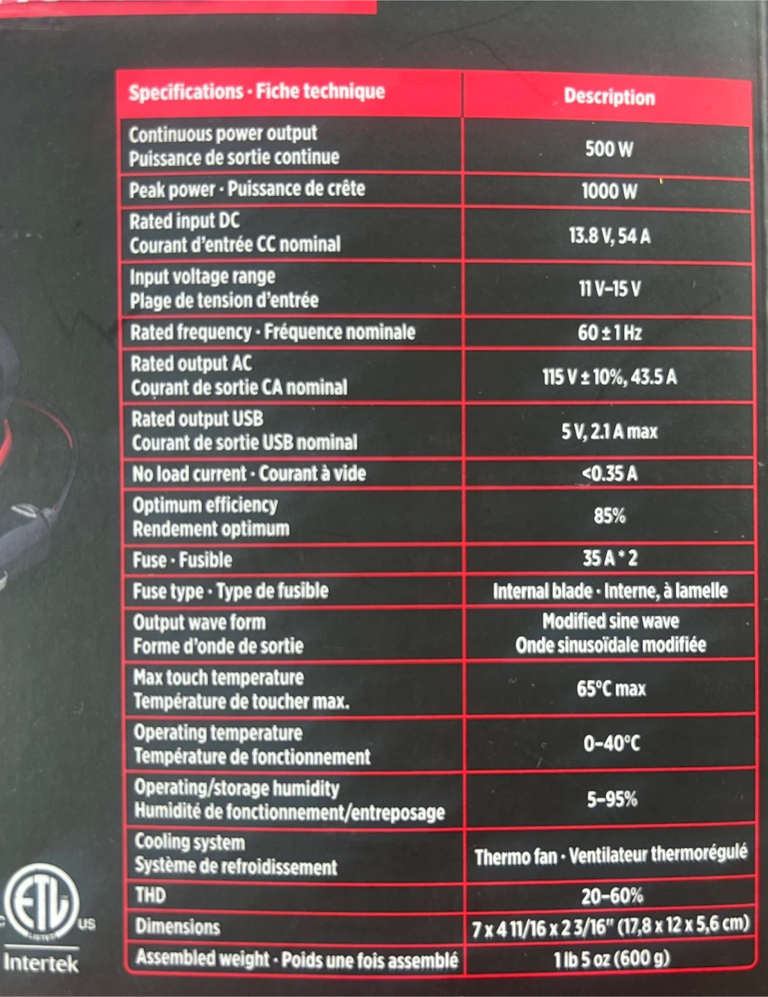 - Continuous power output: 500W