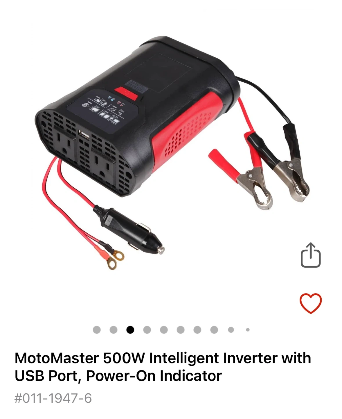 Selling a MotoMaster 500W Intelligent Power Inverter. It converts battery DC power to 120V household AC.