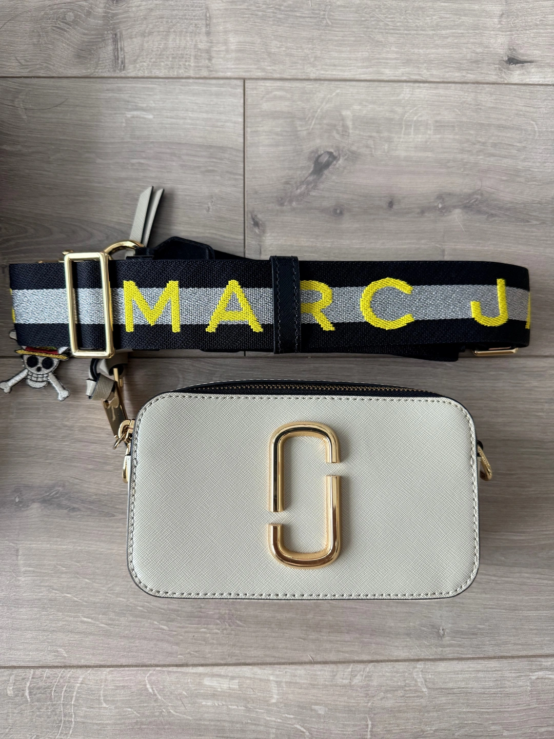 Marc Jacobs snapshot-style crossbody bag with adjustable logo strap.