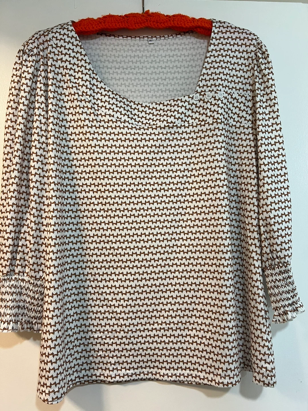 Selling a cute patterned blouse! It features a unique brown and off white design, perfect for adding a touch of style to any outfit. It has long sleeves with elasticated cuffs and a button design on neckline. 70% Rayon, 25 Rayon & 5 Spandex~Wash & Hang to Dry. NWOT