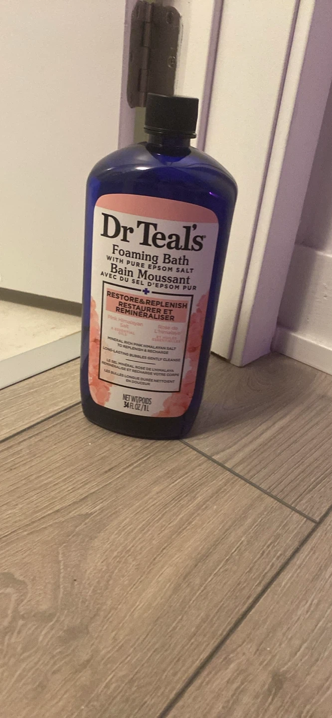 Dr. Teal's Foaming Bath with Pure Epsom Salt to restore and replenish, re-mineralizes with Pink Himalayan Salt and essential oils. It's a 34 fl oz / 1L bottle. Enjoy long-lasting bubbles that gently cleanse