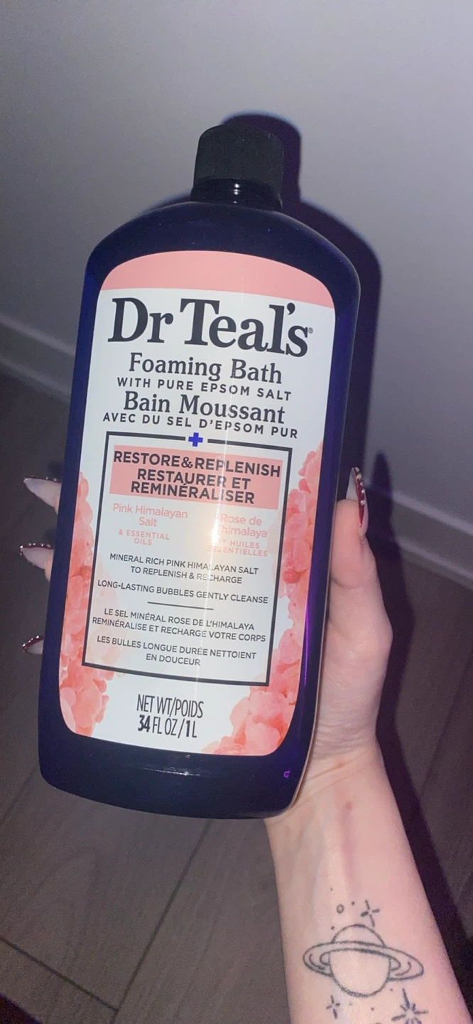 Dr. Teal's Foaming Bath with Pure Epsom Salt to restore and replenish, re-mineralizes with Pink Himalayan Salt and essential oils. It's a 34 fl oz / 1L bottle. Enjoy long-lasting bubbles that gently cleanse