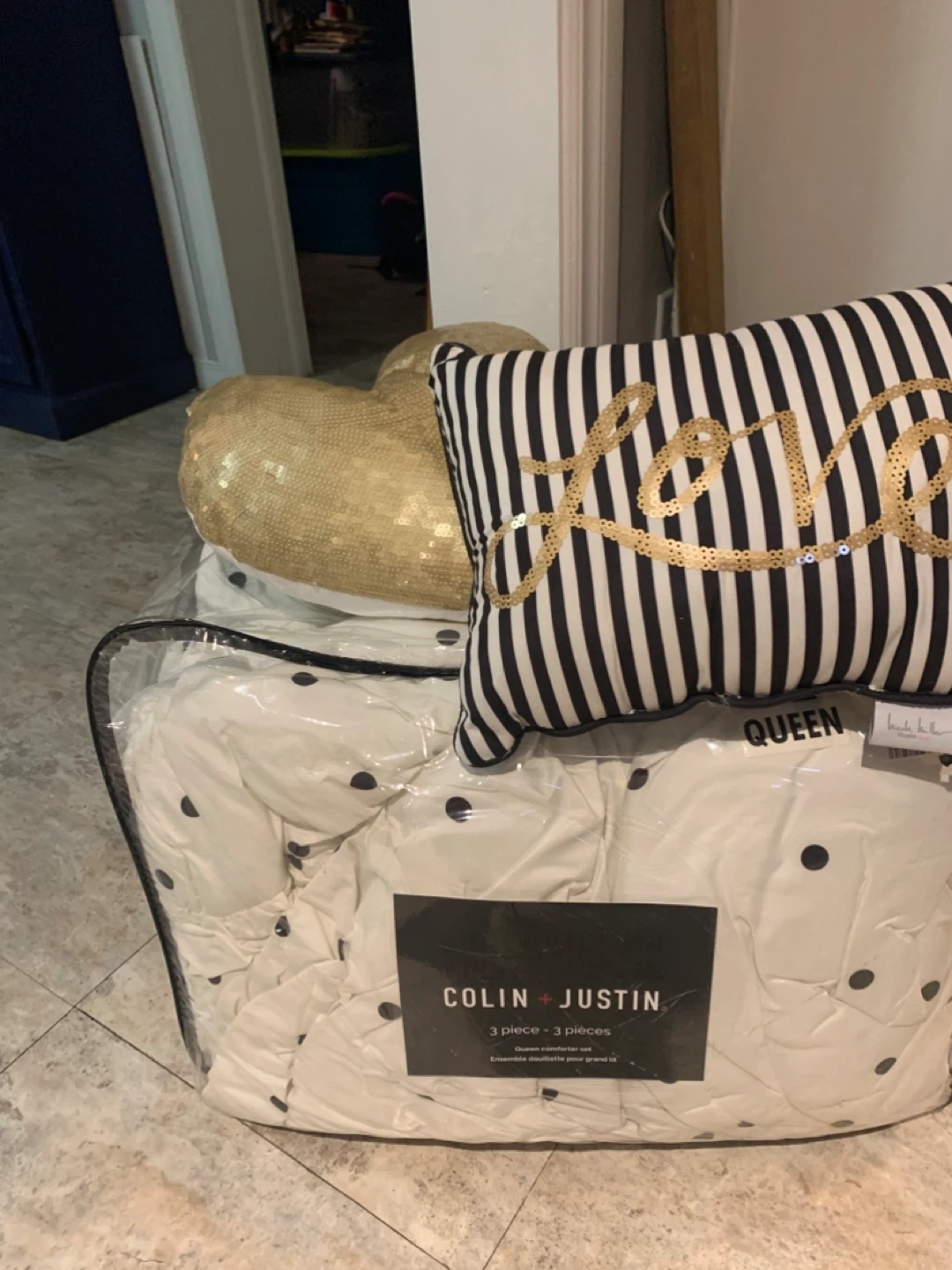 Selling a brand new, in packaging, twin comforter set! Perfect for adding a stylish touch to your bedroom. The set includes a comforter and two pillow shams and decor pillows. Ready to go to a new home!