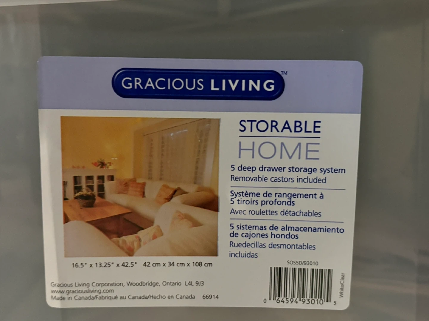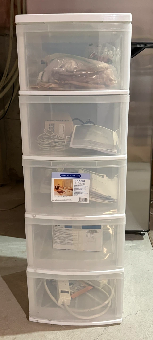 Selling a Gracious Living Storable Home 5 deep drawer storage set. The dimensions are 42 cm x 34 cm x 108 cm. This does not have wheels at the base.