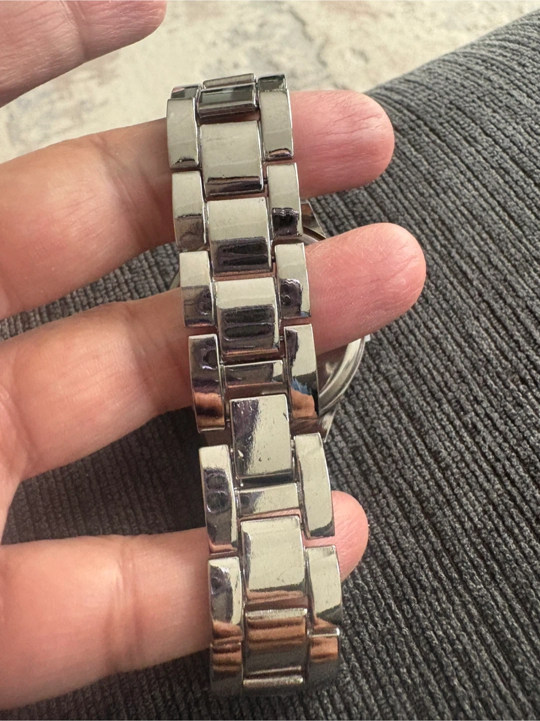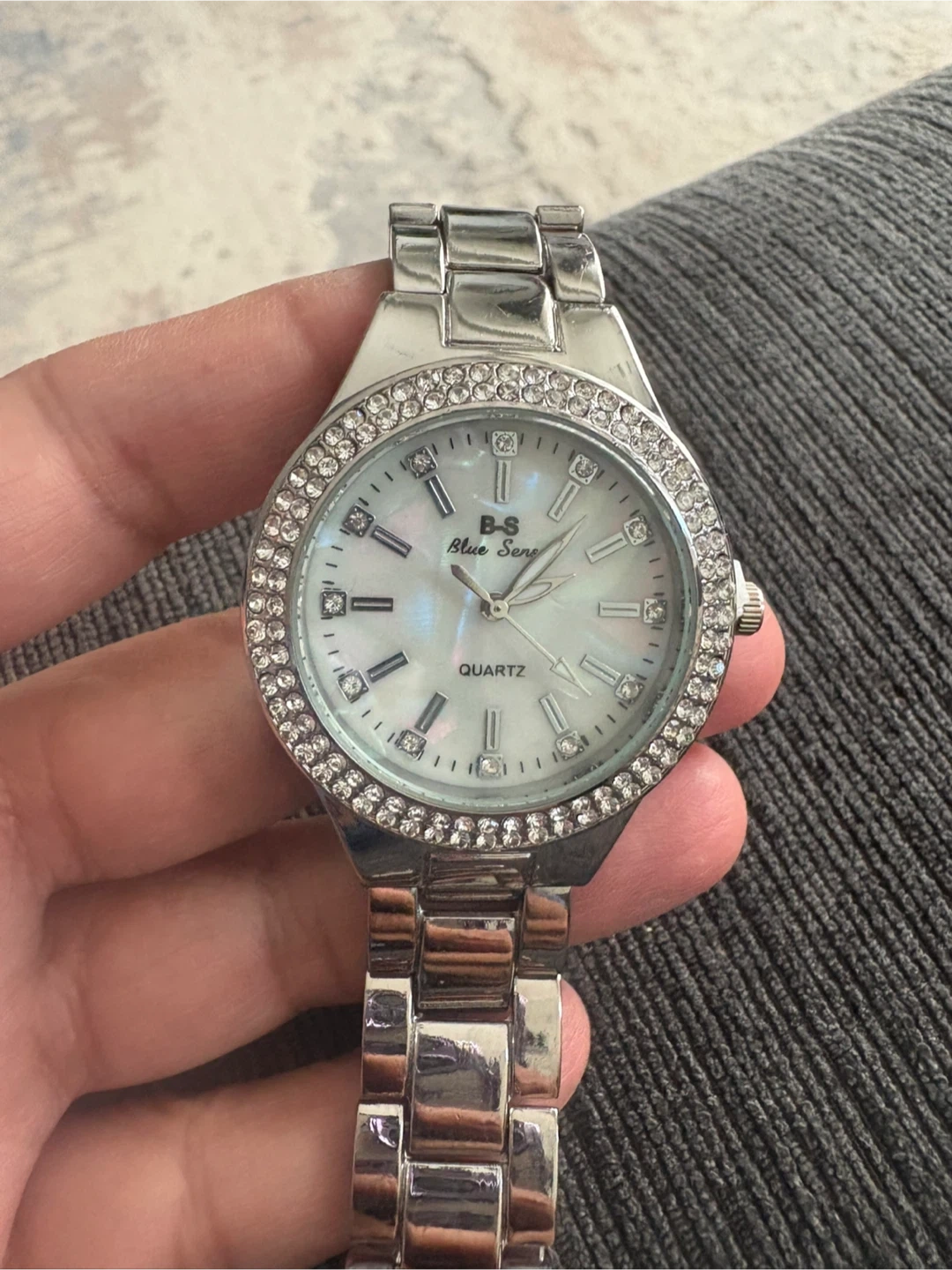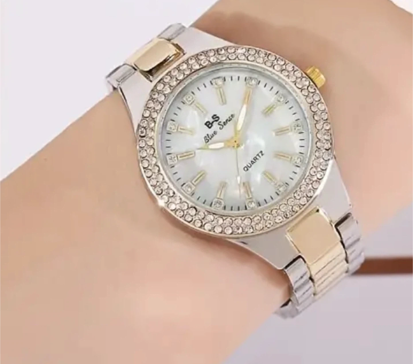 This is a beautiful B-S Blue Sense quartz watch. It features a silver and gold band with a rhinestone-studded bezel. The watch face is mother-of-pearl, adding a touch of elegance. Perfect for adding a bit of sparkle to your everyday look