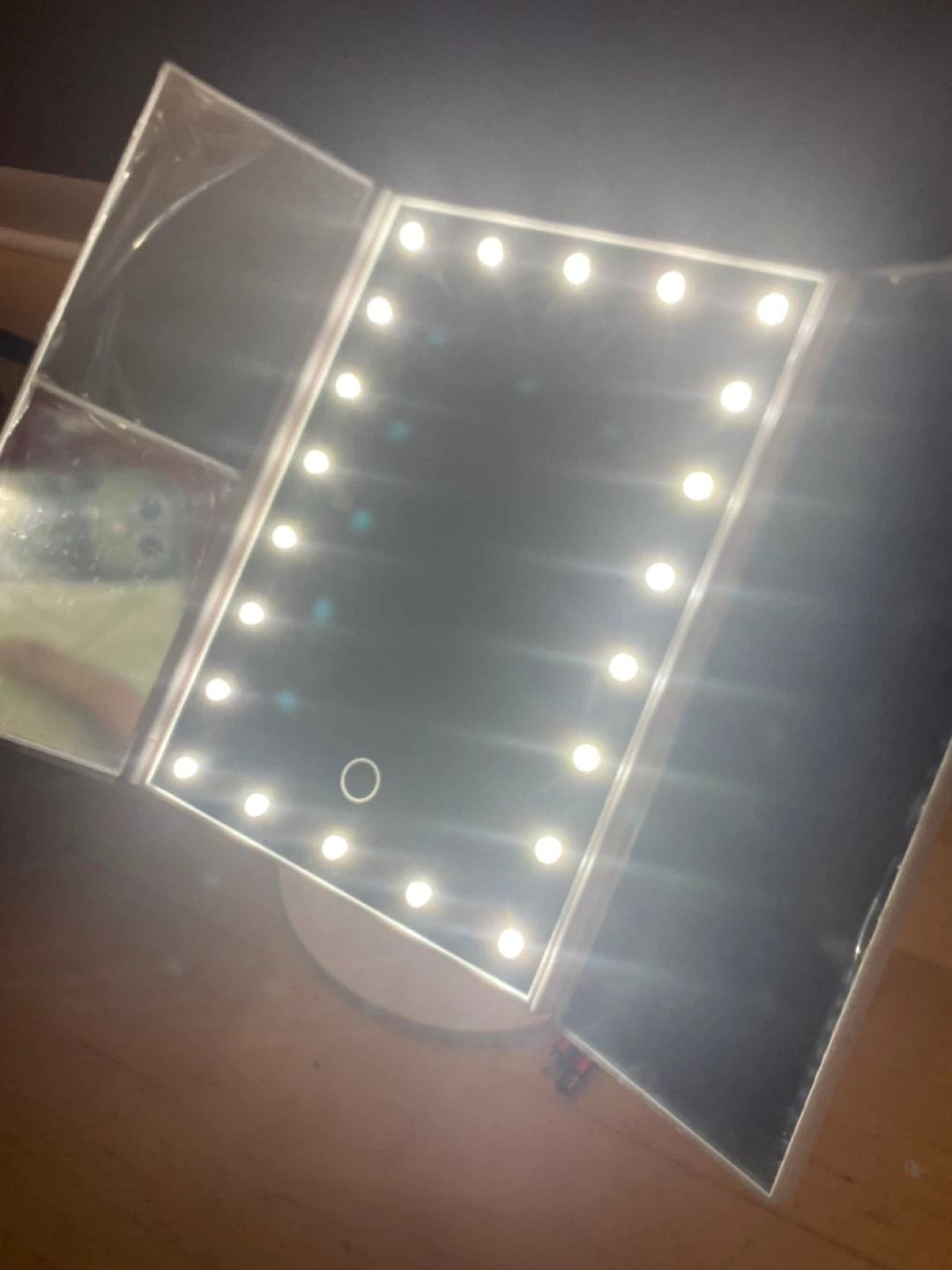 Selling a tri-fold lighted vanity makeup mirror! It features a USB charging port, swivel joint, and rotation axis. There's also a mini storage base, perfect for tiny make-ups. It requires 4xAAA batteries. It's designed to be lightweight and portable!