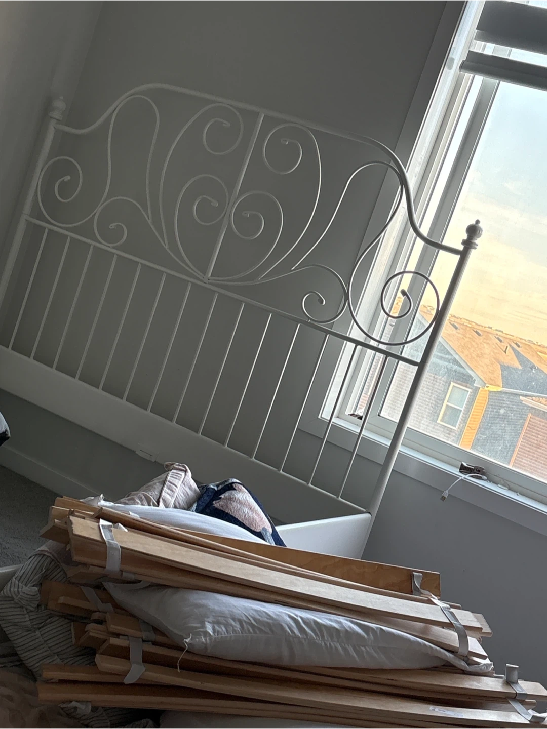 Selling a white metal bed frame. It is currently disassembled for easy transport. All the necessary pieces are included. It's in good condition and ready for a new home!