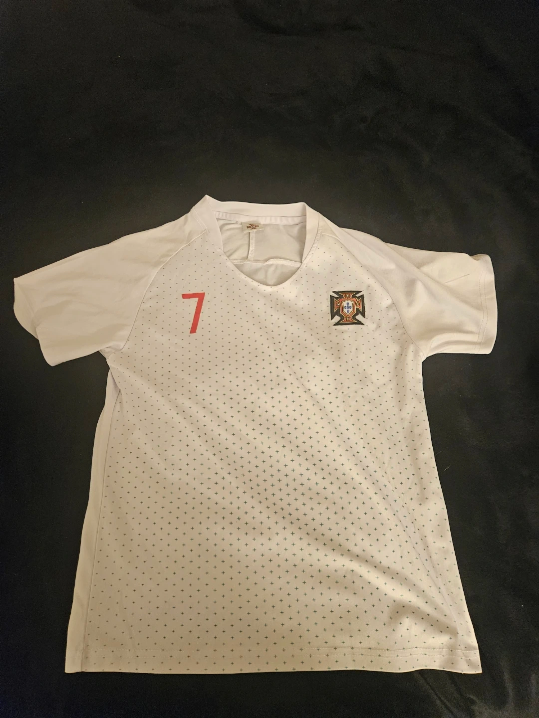 Selling a Portugal soccer jersey with the number 7 on it. It's white and has the Portuguese coat of arms on the chest