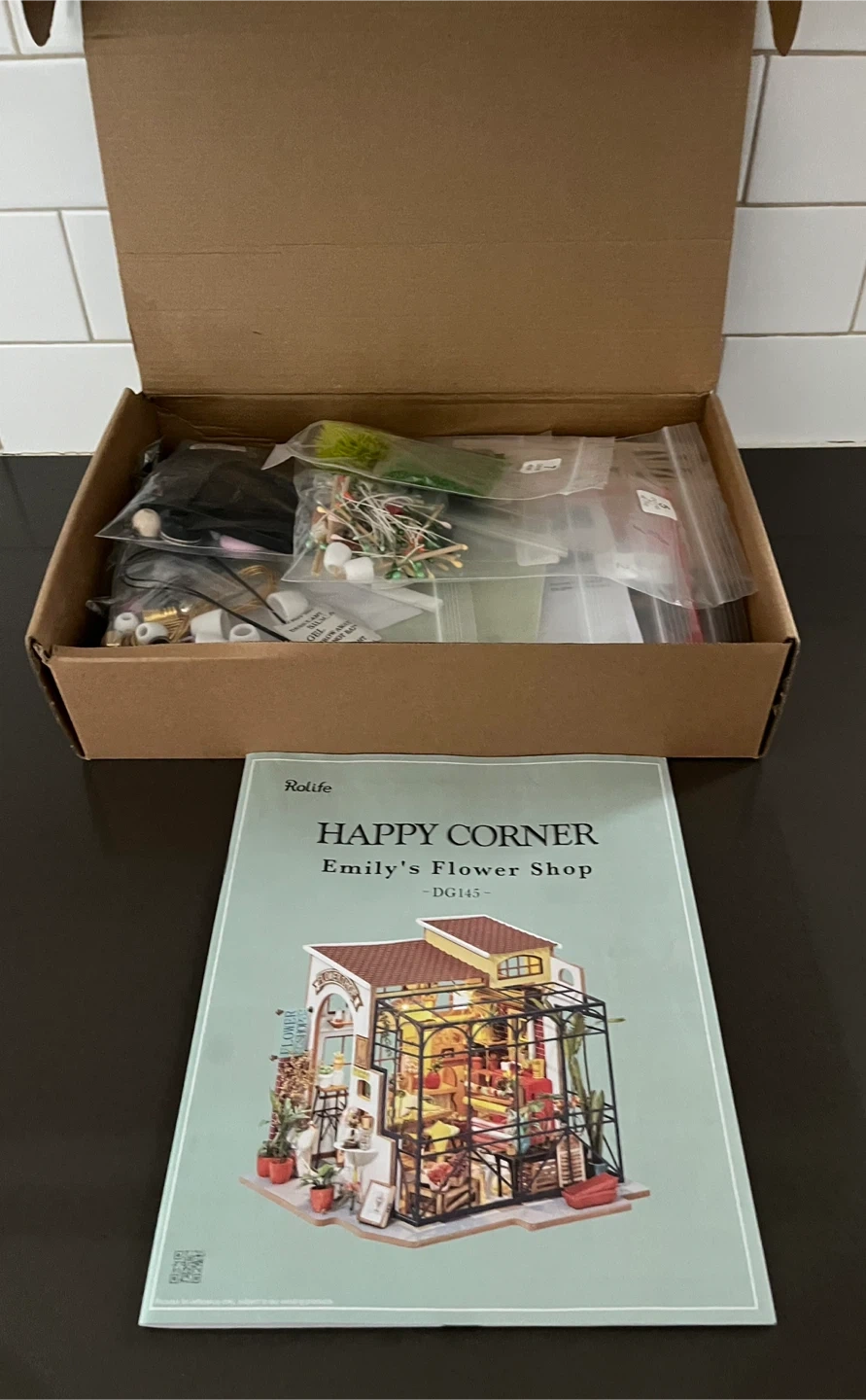 Pick up in Utopia. This Rolife DIY Miniature Dollhouse, Emily's Flower Shop DG145, is a delightful project for hobbyists and crafters. The red locker was started but not completed and is missing the paint brush.
