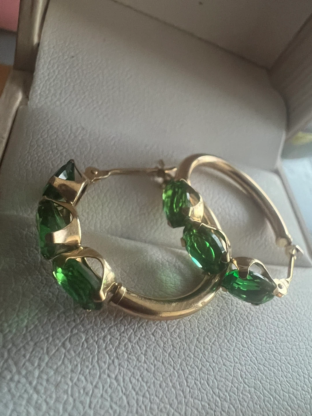 These are a pair of 14 k gold hoop earrings, each adorned with lab emeralds. They have a classic and elegant look, perfect for adding a touch of colour to any outfit