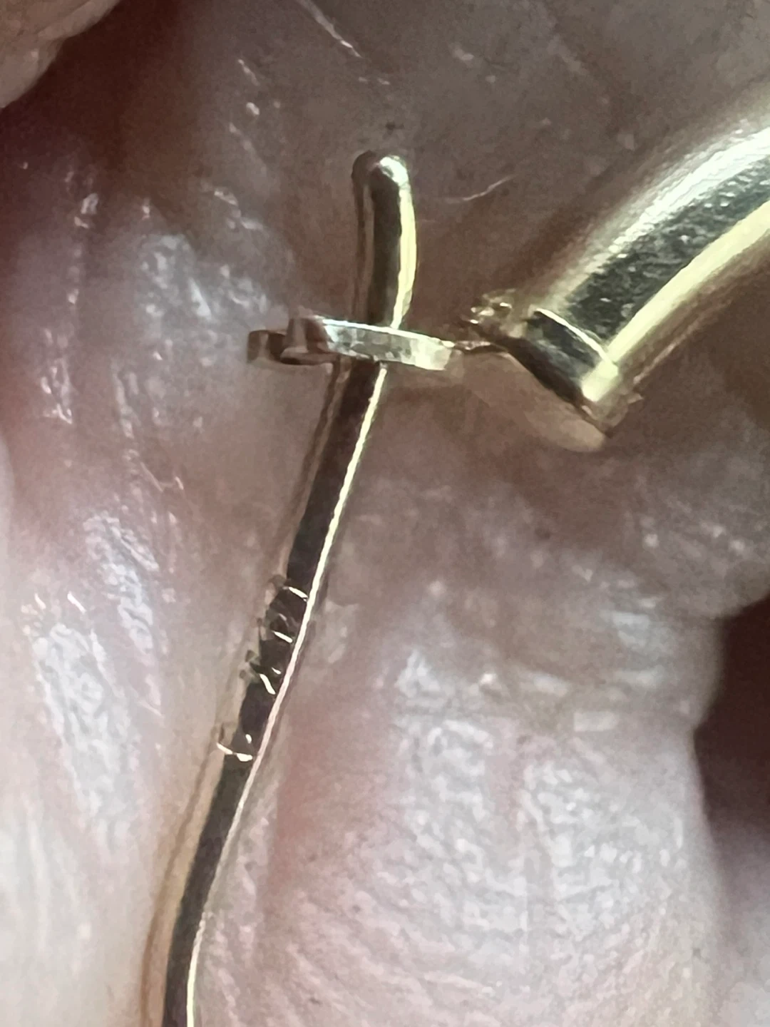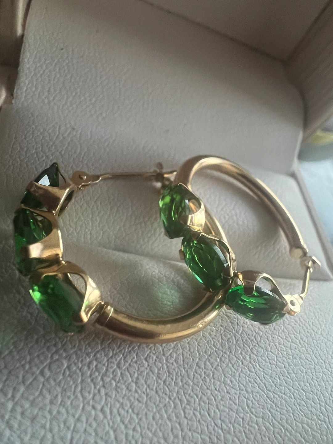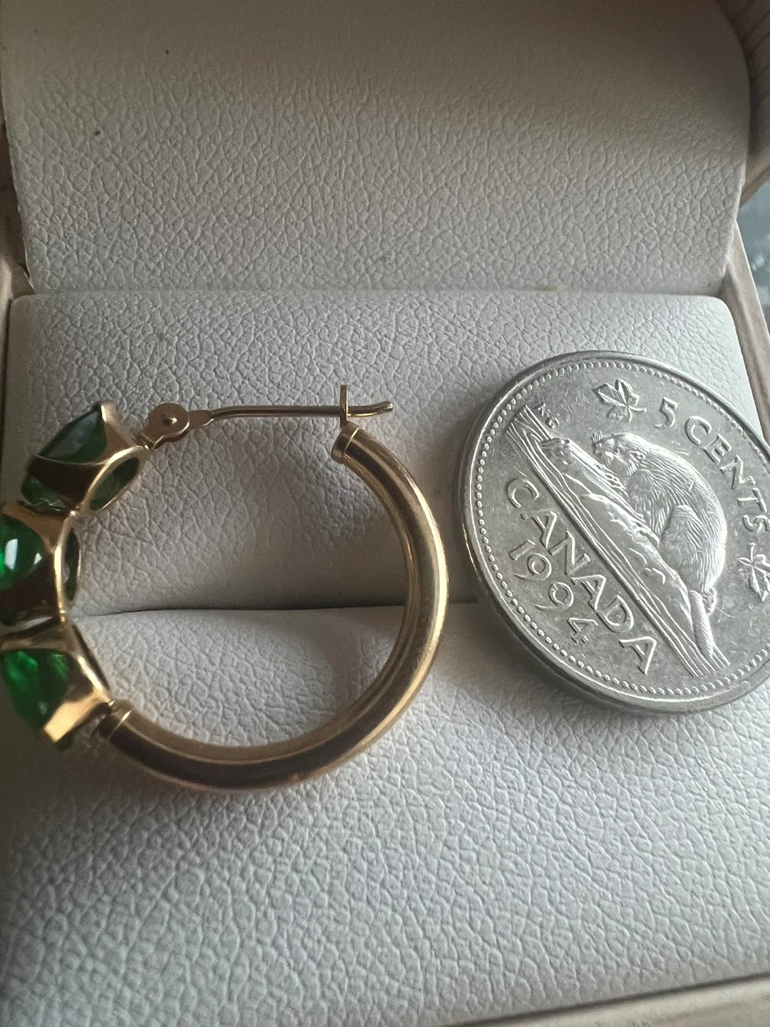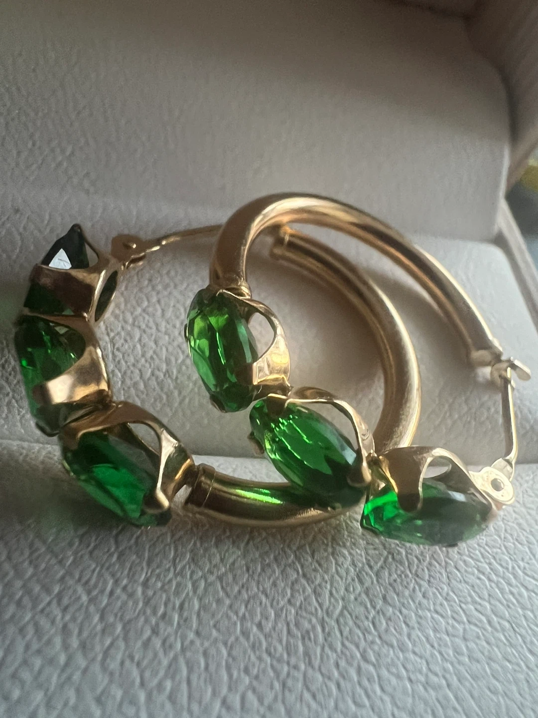 These are a pair of 14 k gold hoop earrings, each adorned with lab emeralds. They have a classic and elegant look, perfect for adding a touch of colour to any outfit