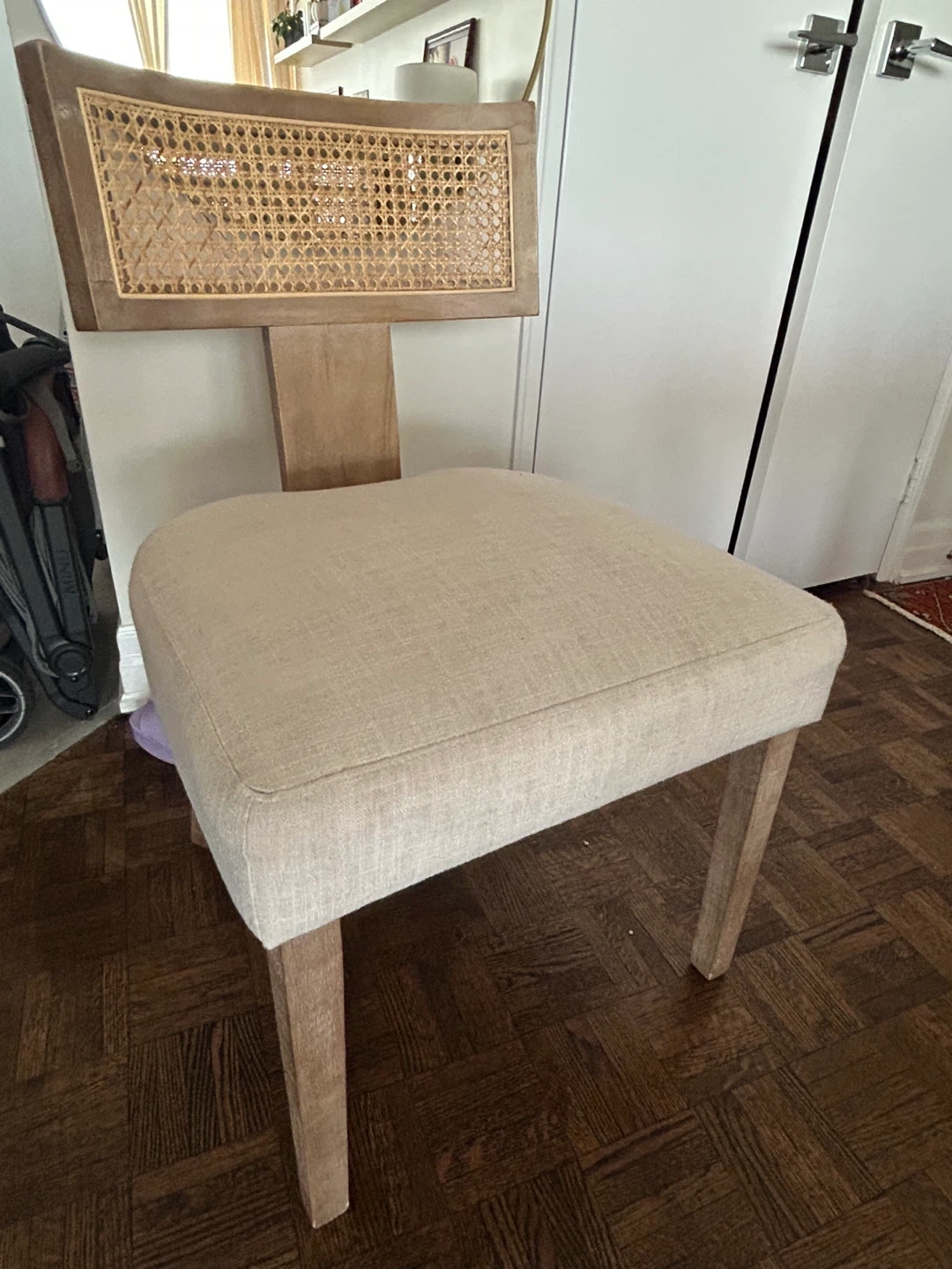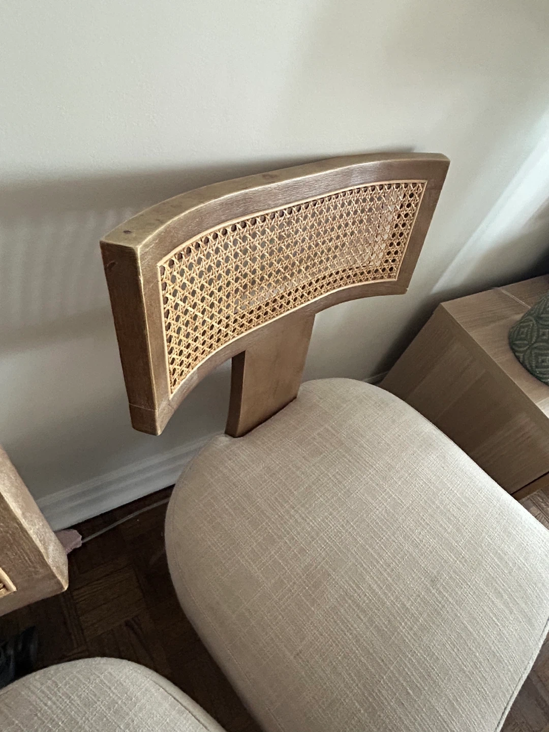 Selling a set of four dining chairs. They have a lovely rattan back and neutral-coloured seat.