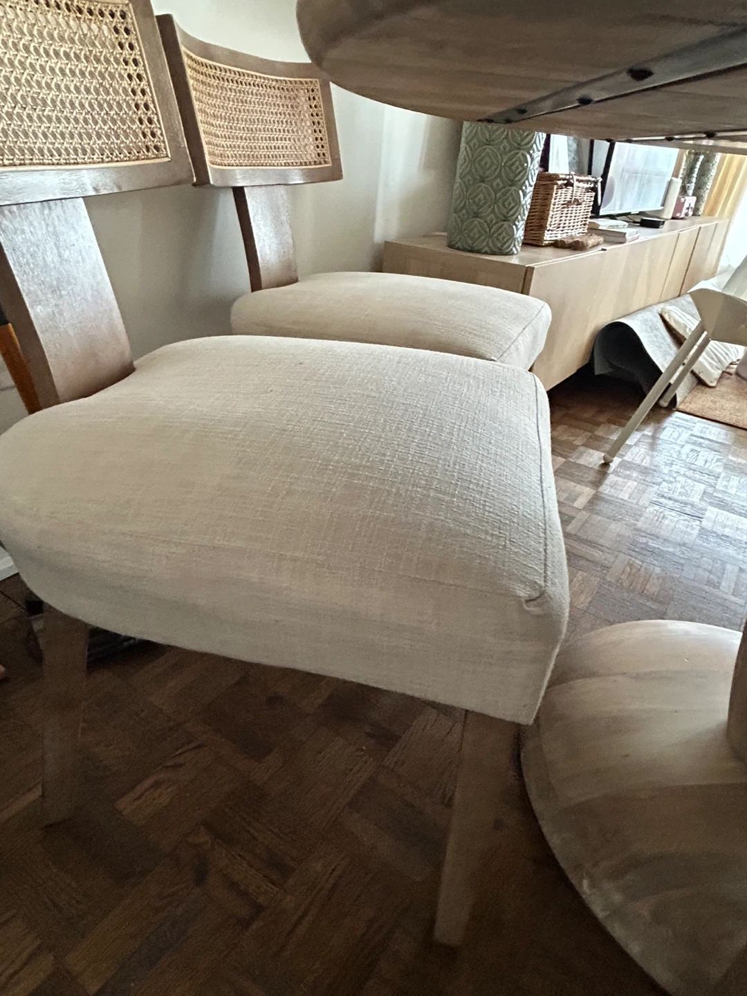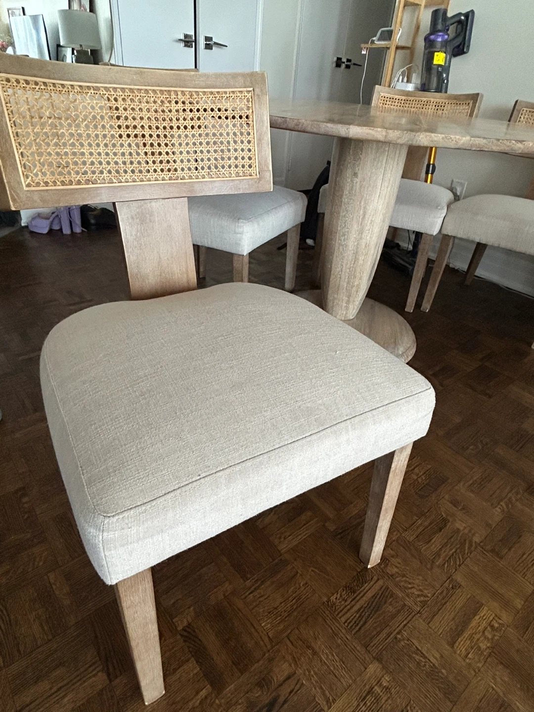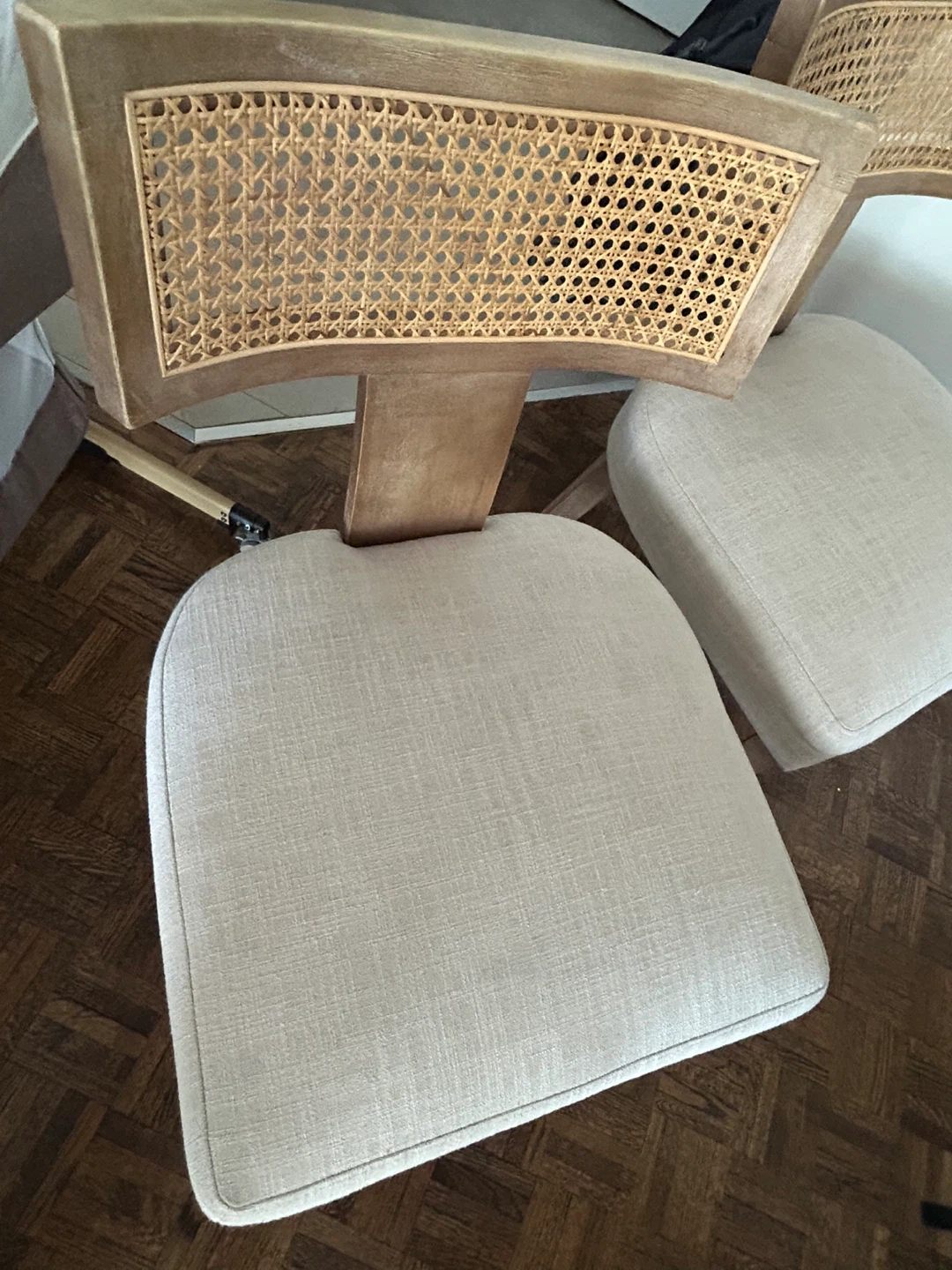 Selling a set of four dining chairs. They have a lovely rattan back and neutral-coloured seat.