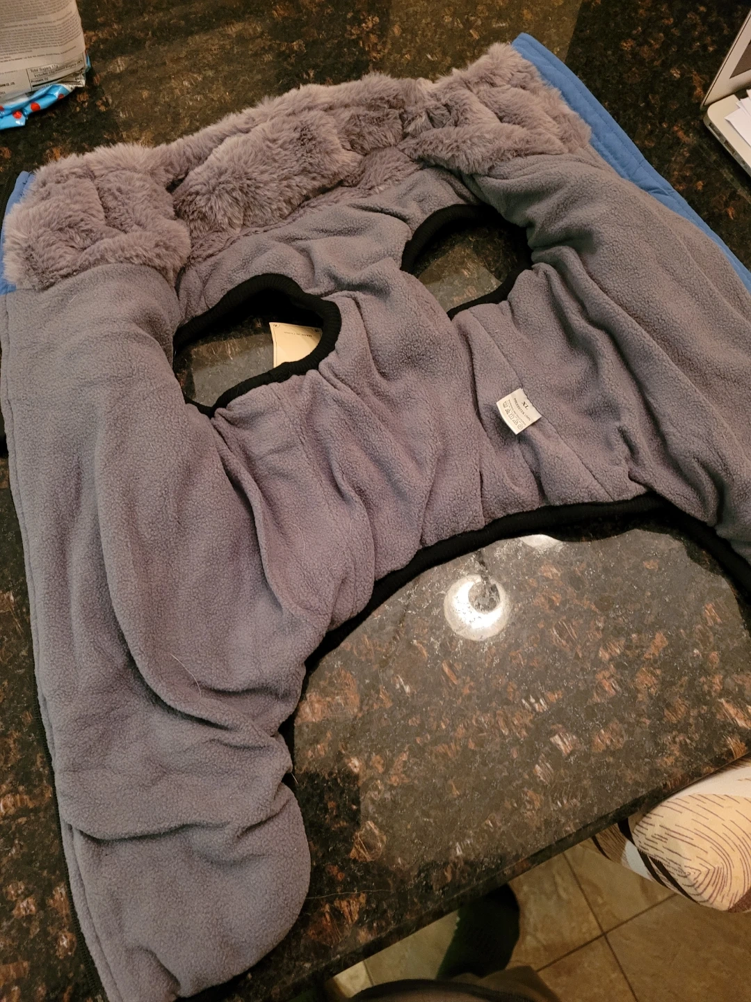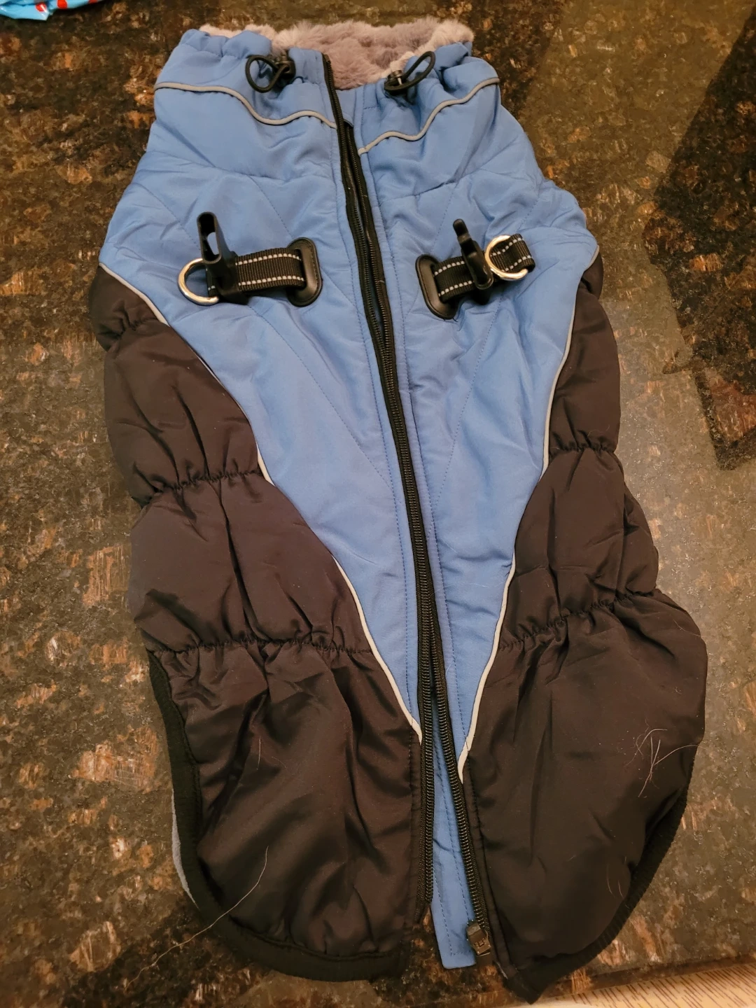 Selling a dog coat in size XL! It's a cozy fleece material, perfect for keeping your furry friend warm during those chilly walks. The coat is blue and black, with a grey fleece lining, and has a zipper for easy on and off