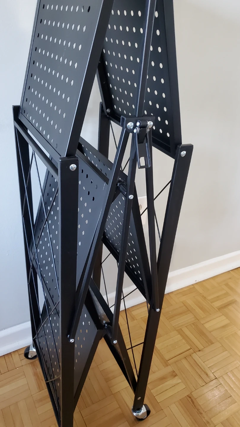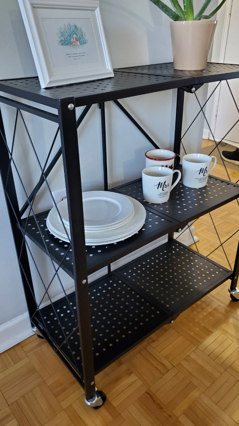 This foldable kitchen rack is only slightly used in very good condition, and easily foldable, made of heavy-duty metal which has 3 shelves w/ max load capacity of 250 lbs each. Wheels make it portable and can also be locked to be stable. Check last pic for dimensions. Please don't ask for a lower price.