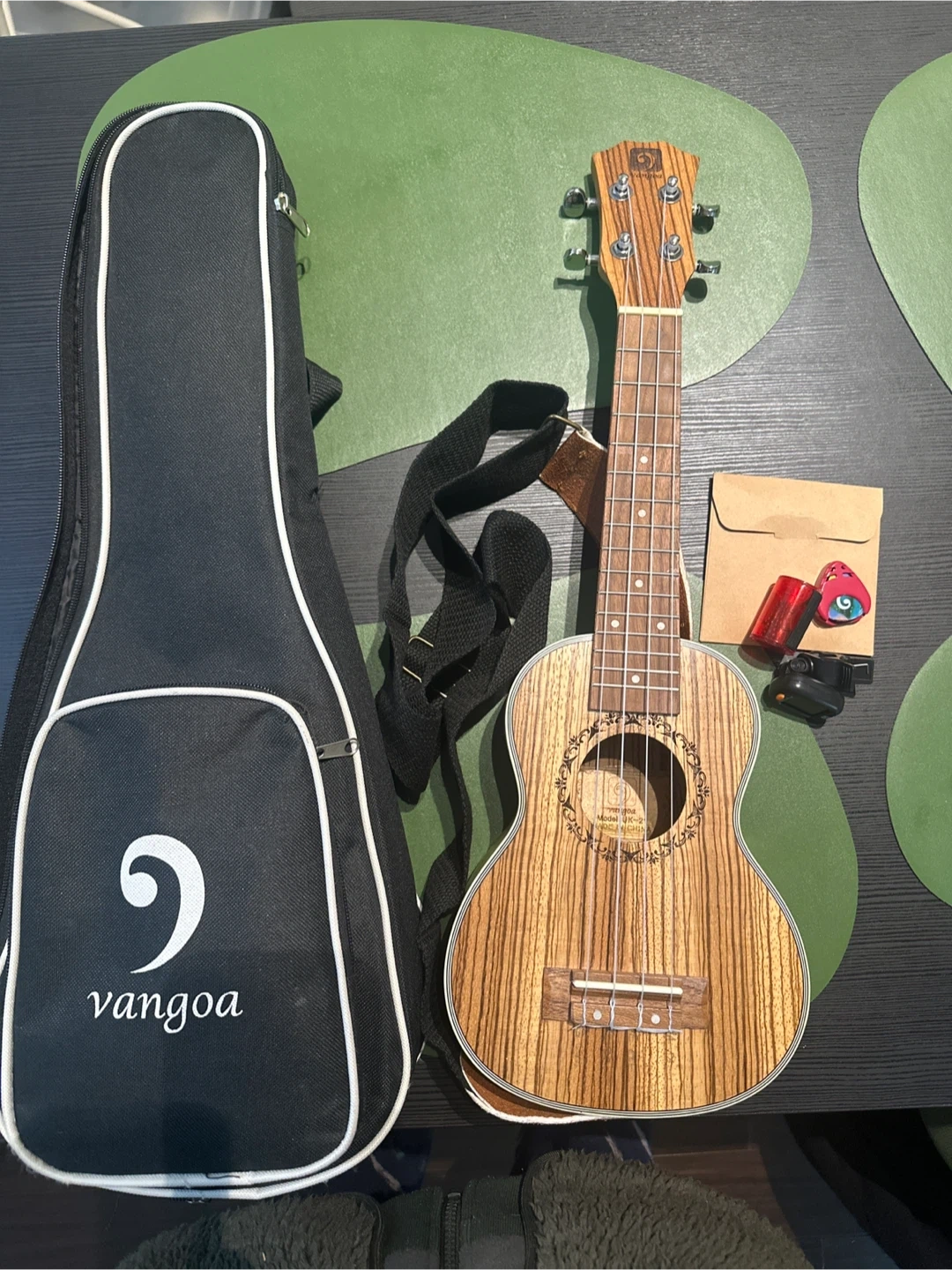 Selling a Vangoa UK-21 Soprano Ukulele in excellent condition! It has a beautiful zebrawood body and comes with a case for easy transport. Also included are a strap, tuner, and picks to get you started right away! Perfect for beginners or anyone looking for a fun, portable instrument