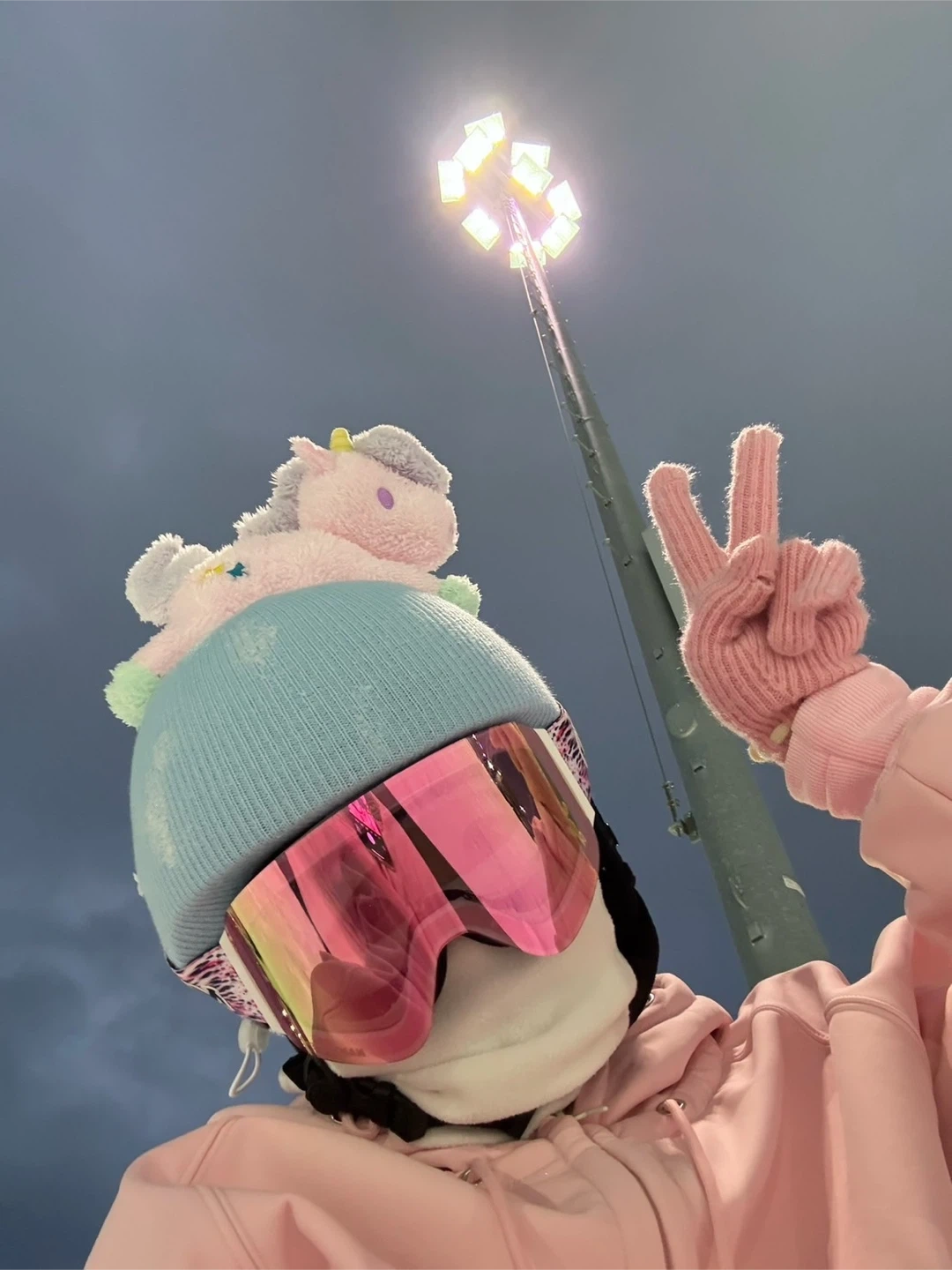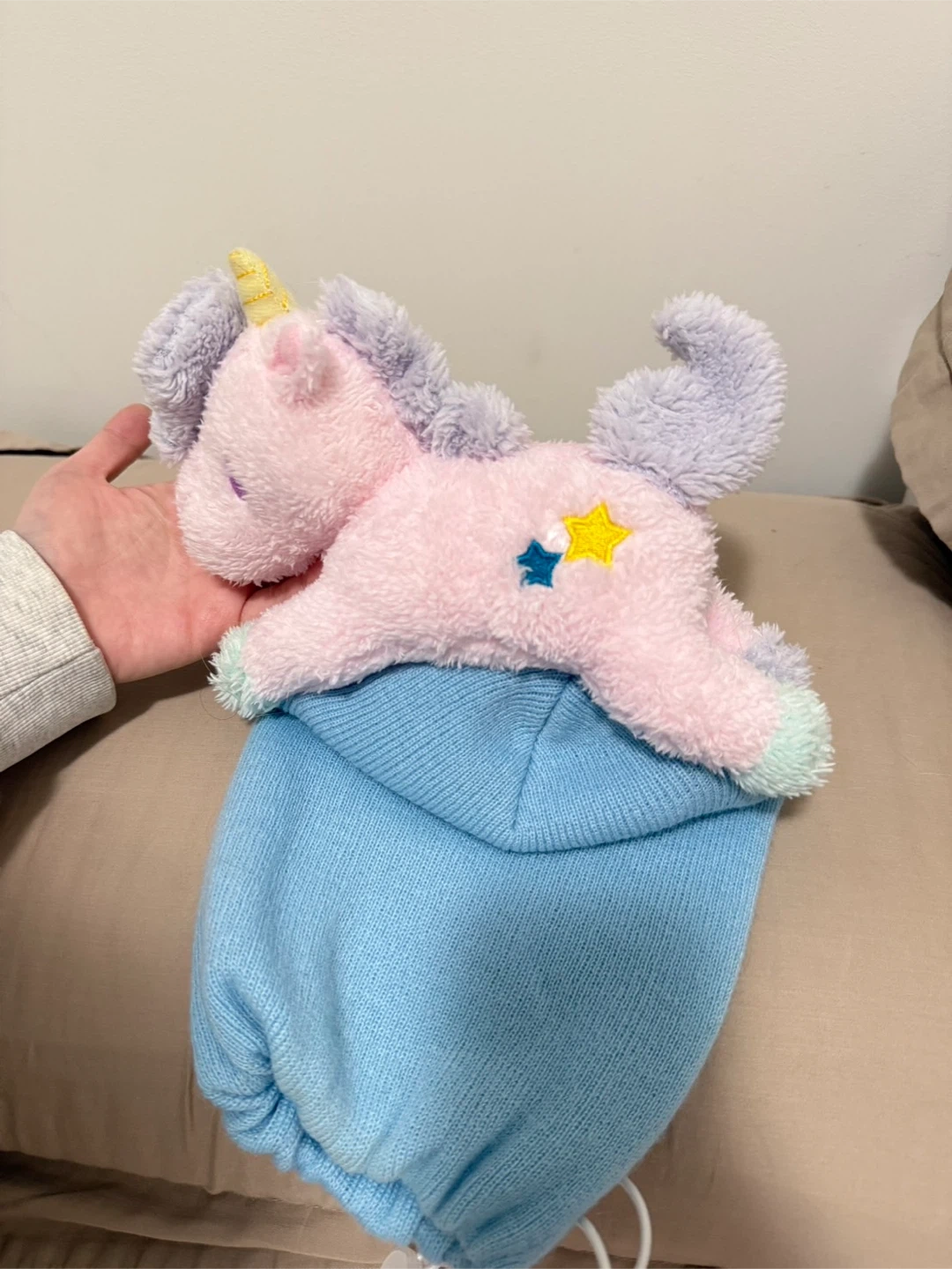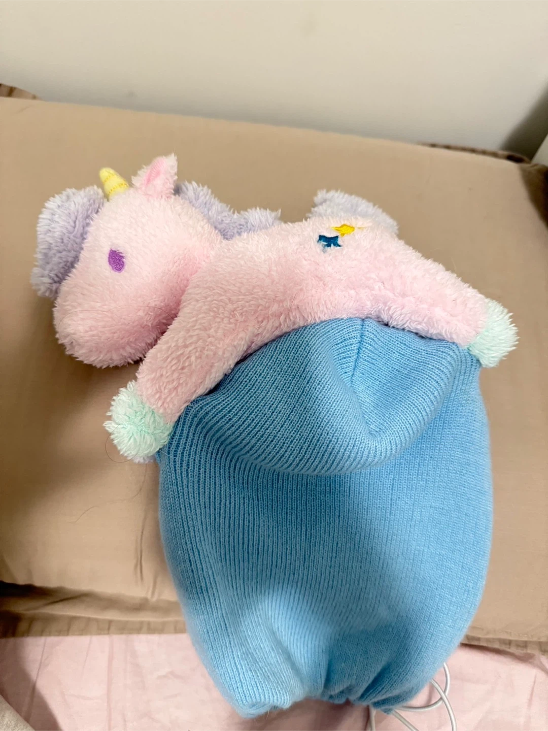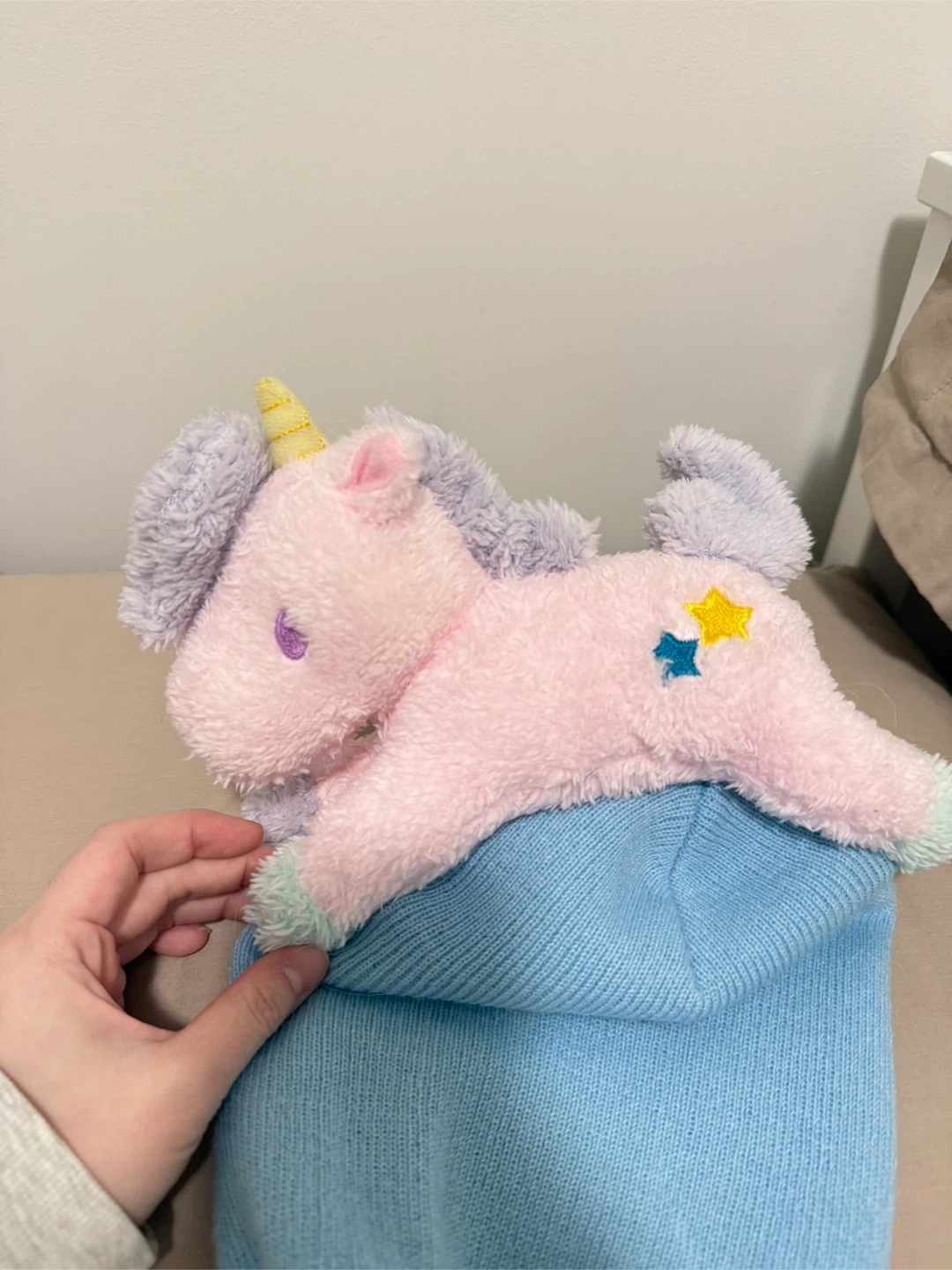 A cute light blue beanie with an attached pink unicorn helmet cover! It's in great condition and ready for a new owner. Perfect for keeping warm and adding a touch of whimsy to your winter outfits