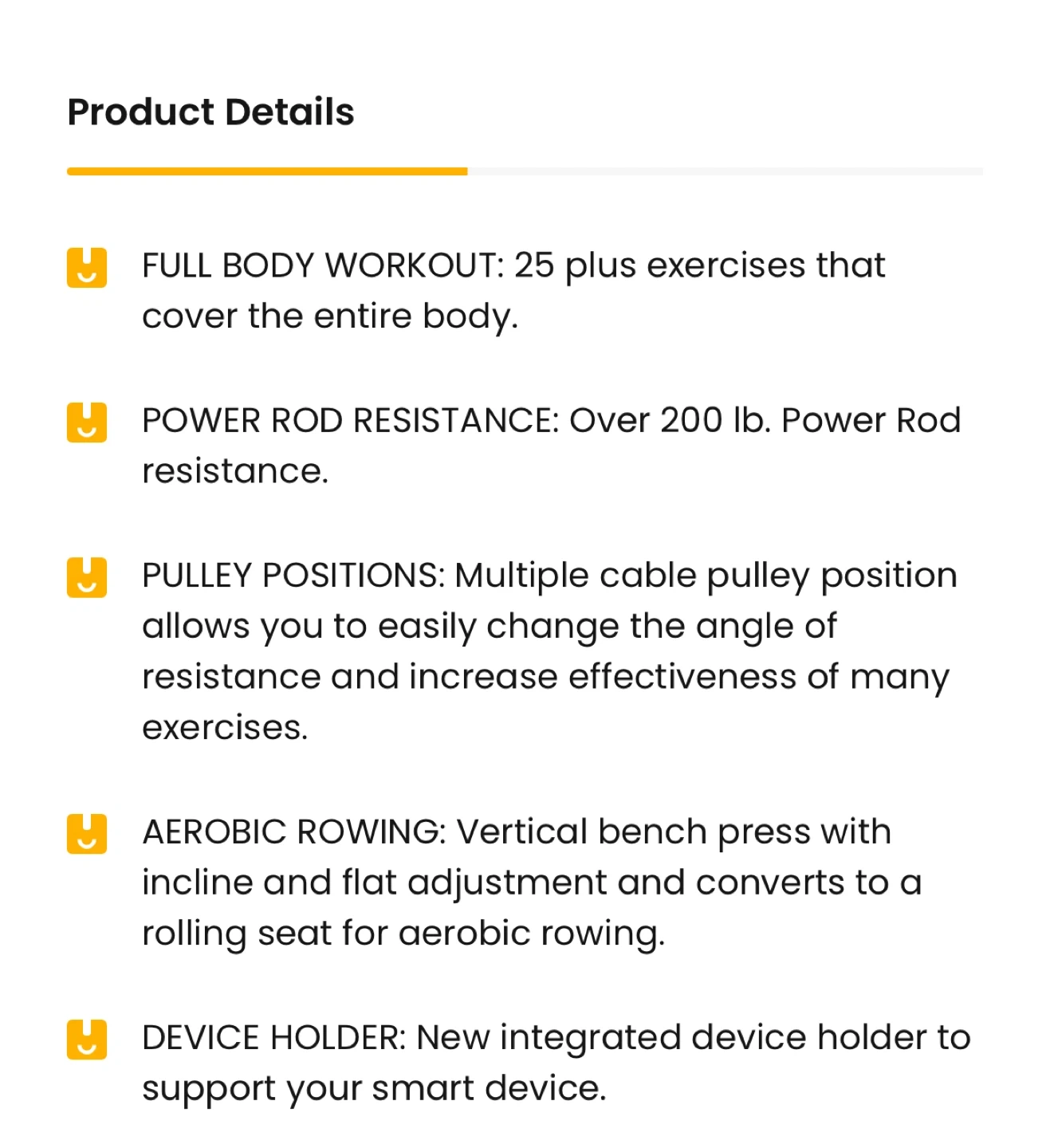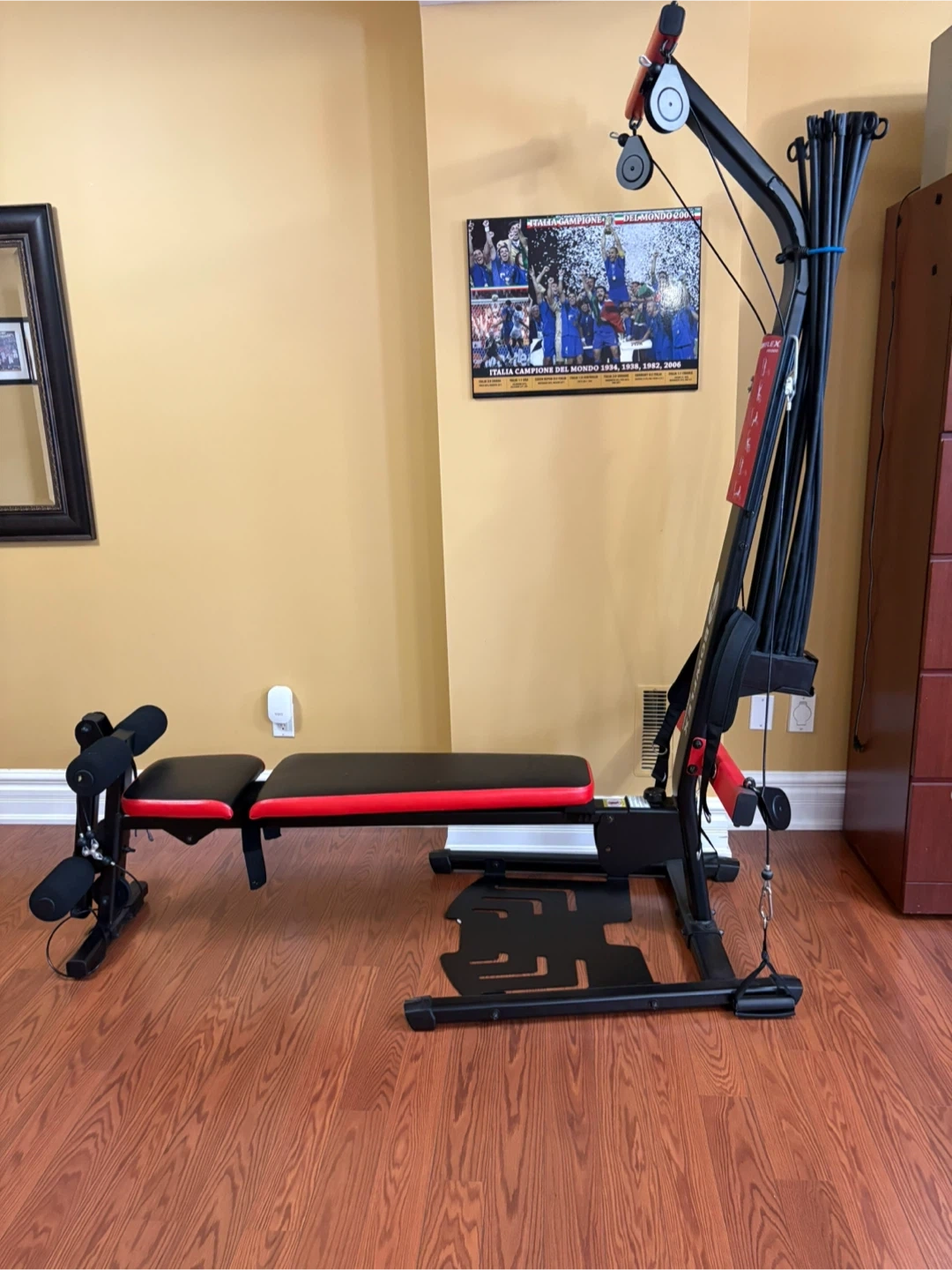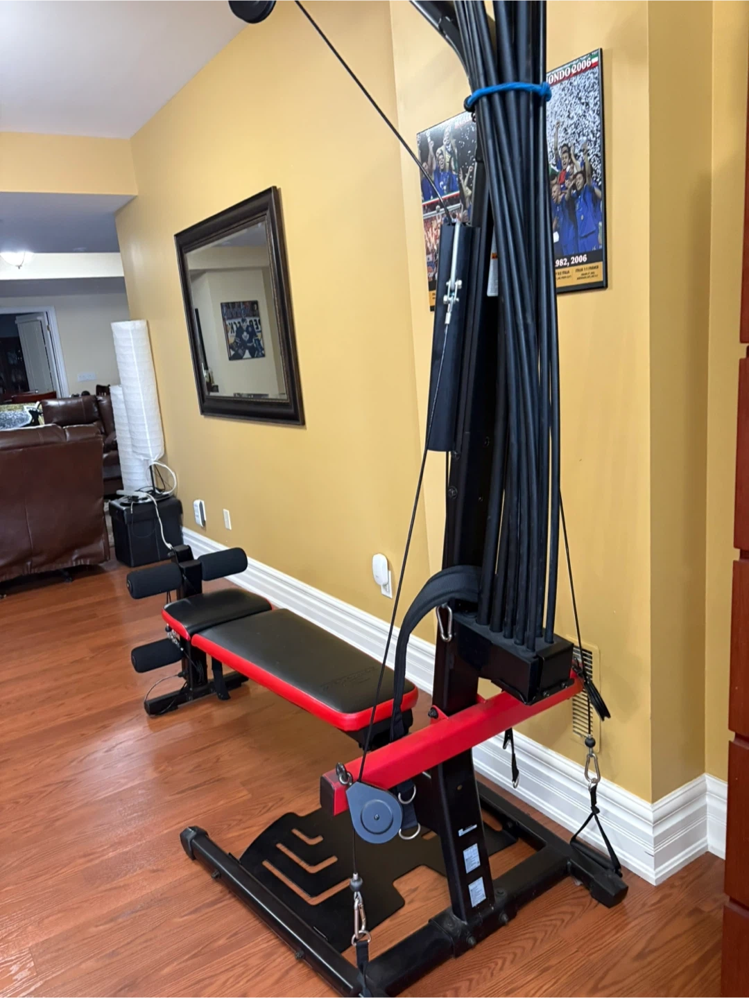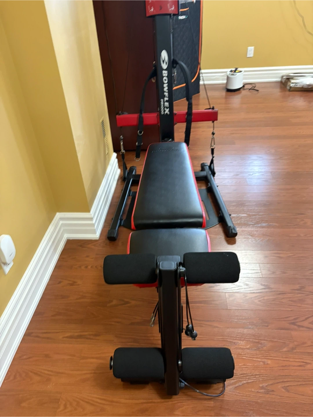 Get a full body workout with this Bowflex PR1000 home gym! It offers over 25 exercises to cover your entire body. The power rod resistance provides over 200 lb of resistance. Multiple cable pulley positions allow you to easily change the angle of resistance and increase the effectiveness of many exercises. It also features a vertical bench press with incline and flat adjustment that converts to a rolling seat for aerobic rowing and a device holder to support your smart device