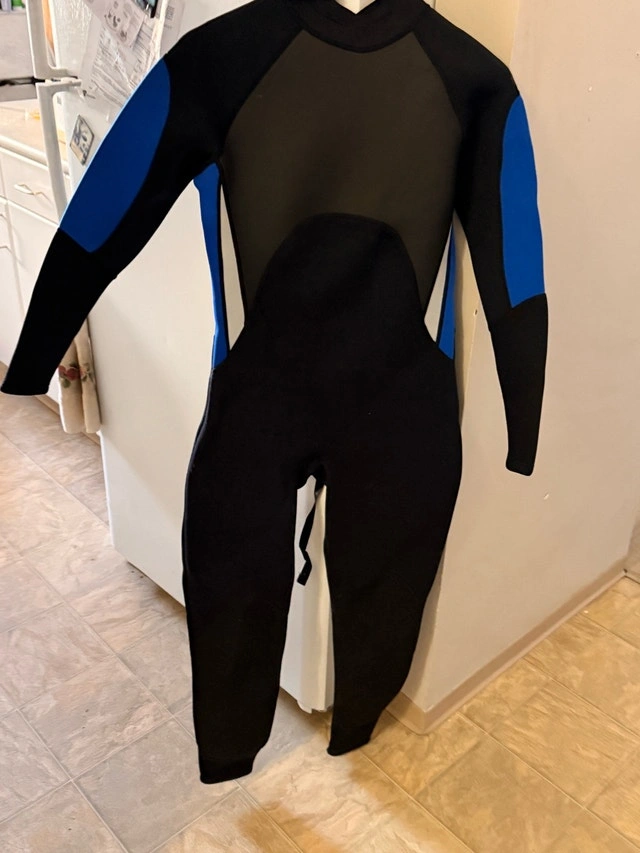 This is a black, blue, and grey wetsuit brand new just out of wrap for photo. It has a zipper down the back and is perfect for keeping warm while doing watersports. Size medium. If you're seeing this ad, the wetsuit is still available, no need to ask!