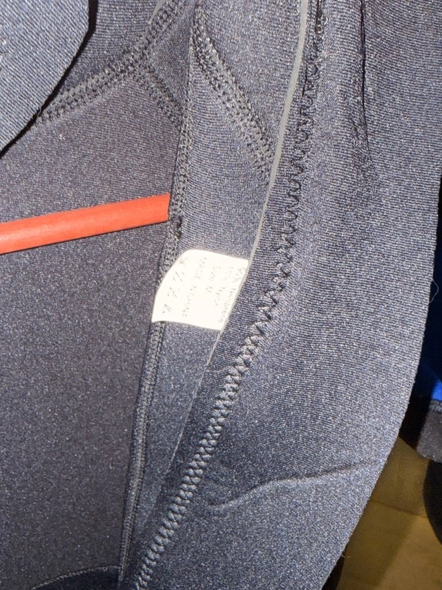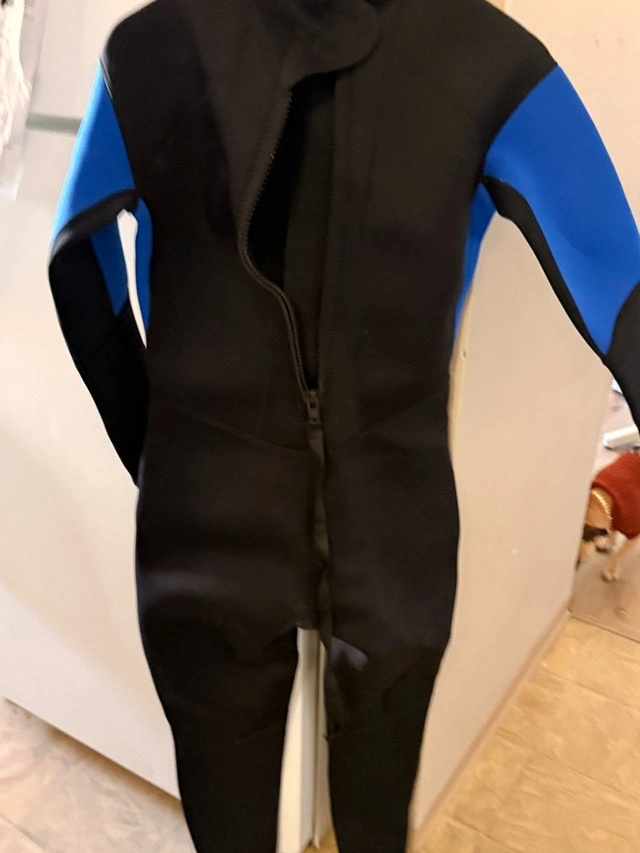 This is a black, blue, and grey wetsuit brand new just out of wrap for photo. It has a zipper down the back and is perfect for keeping warm while doing watersports. Size medium. If you're seeing this ad, the wetsuit is still available, no need to ask!