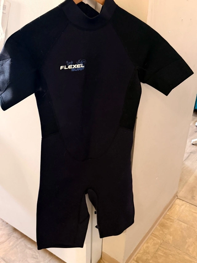 This is a Flexel wetsuit, perfect for keeping you warm while surfing or swimming. This used short-sleeve wetsuit has a convenient back zipper. Additional details: