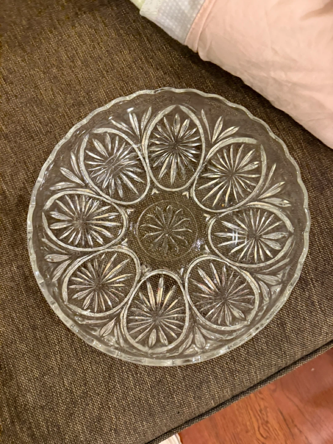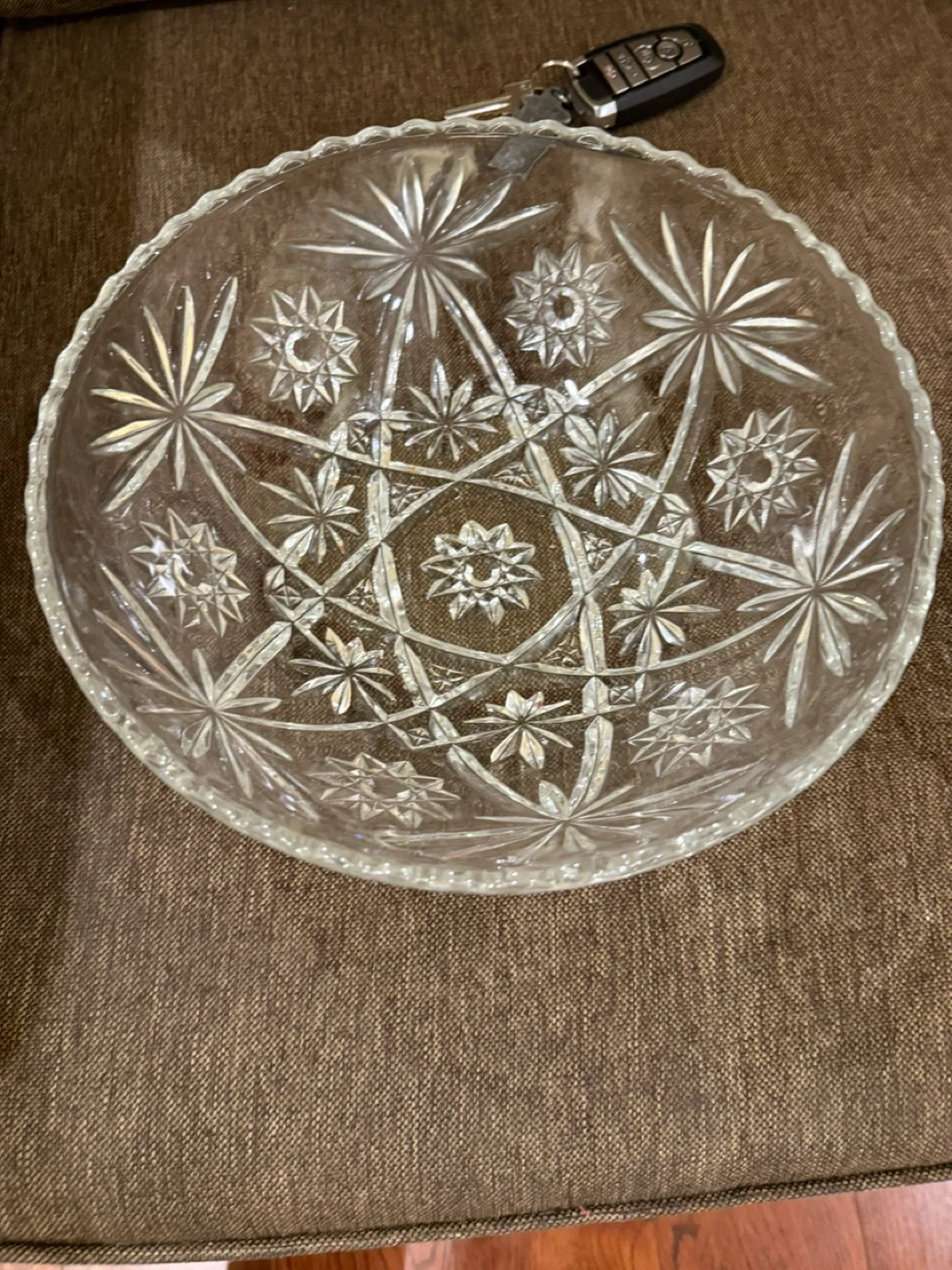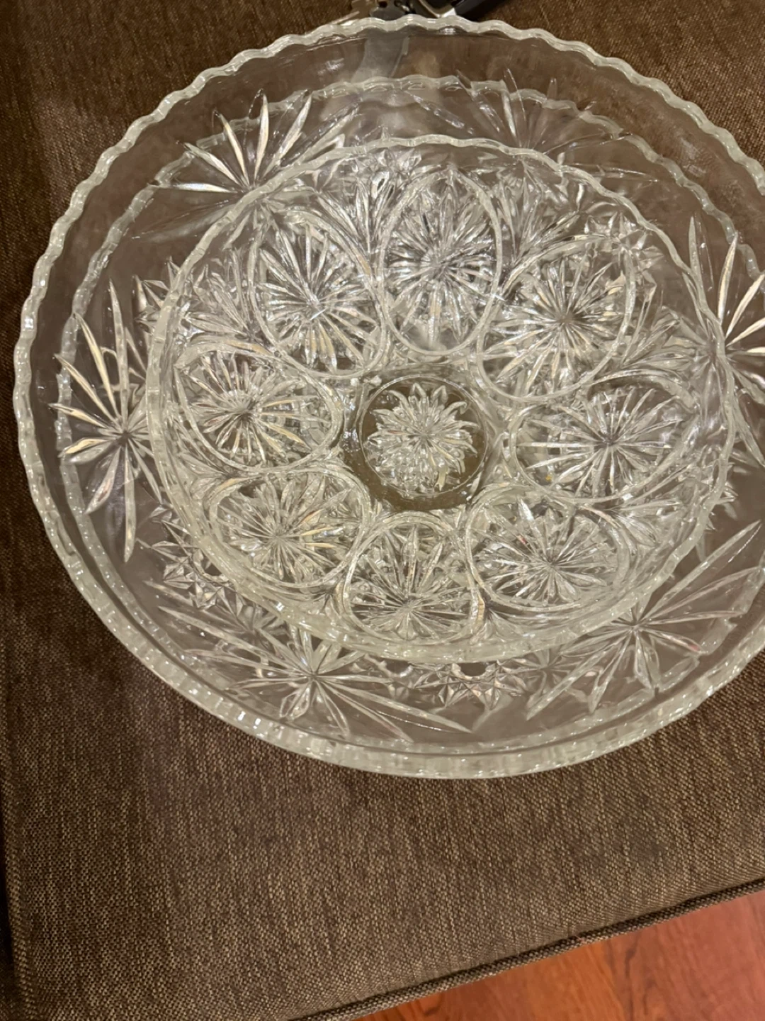 Selling a set of crystal serving dishes. They are perfect for serving appetizers or desserts at your next gathering! They have a beautiful design and are in great condition