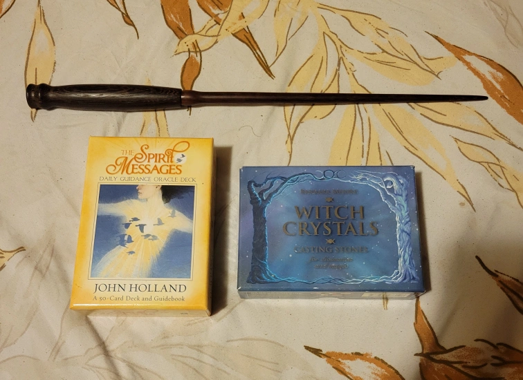 I'm selling The Spirit Messages Daily Guidance Oracle Deck by John Holland, which includes a 50-card deck and guidebook. Also included is the Witch Crystals Casting Stones set. Perfect for anyone interested in divination and spiritual guidance! and real dual wood wand.