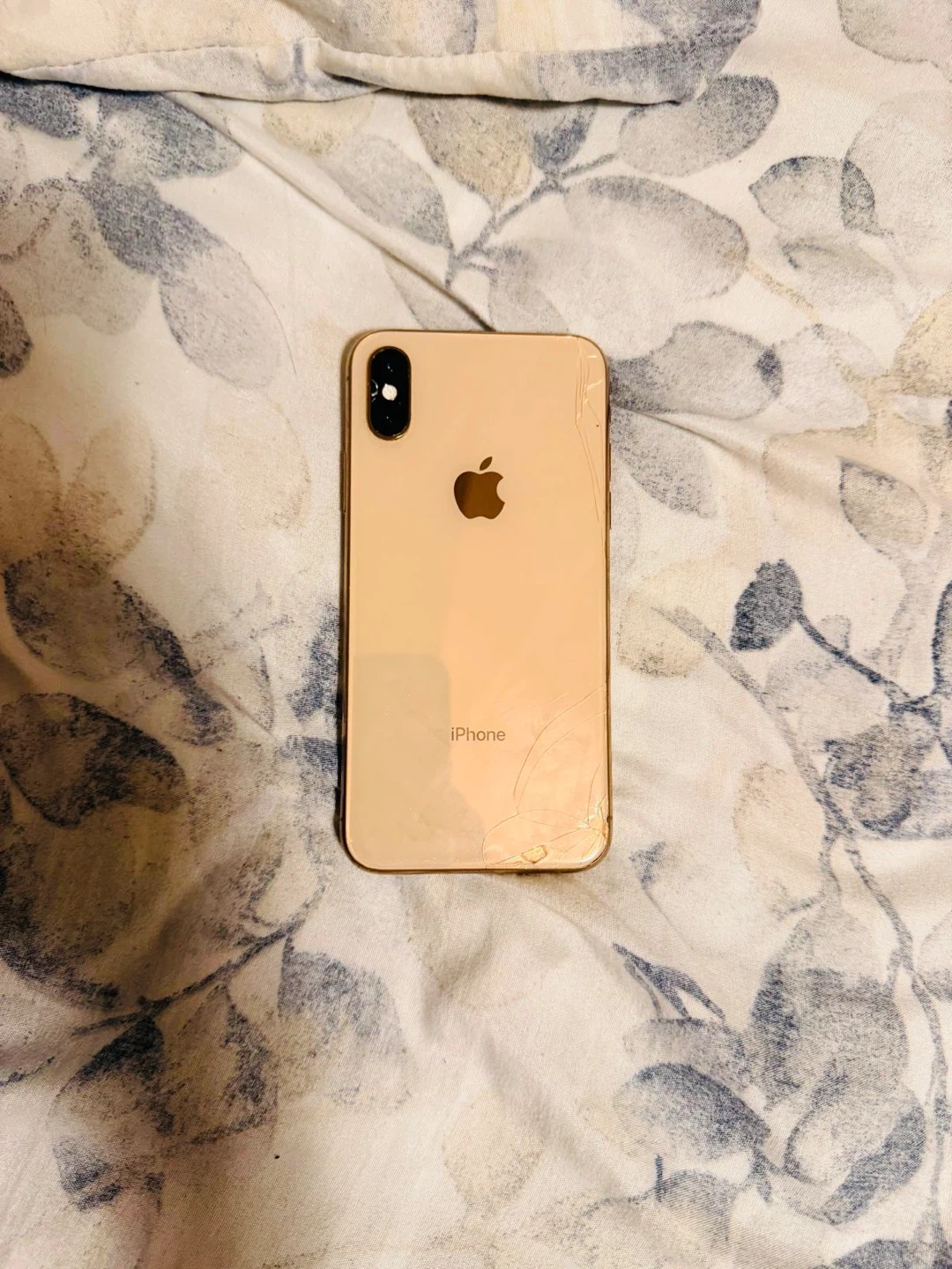 Selling an iPhone XS in gold. Please note that the screen and back are cracked. Still functions, but selling as is. Battery health 67% 64gb
