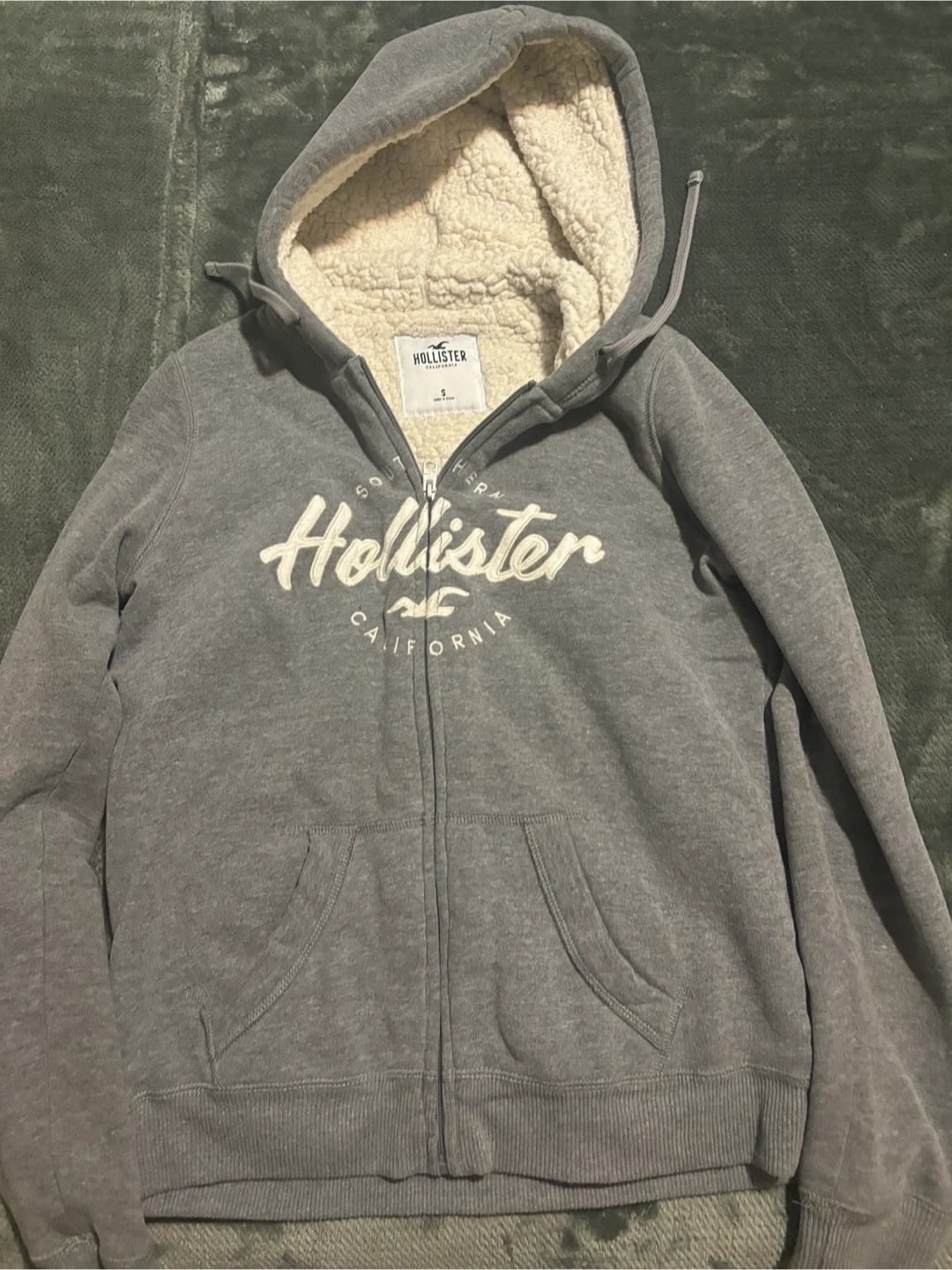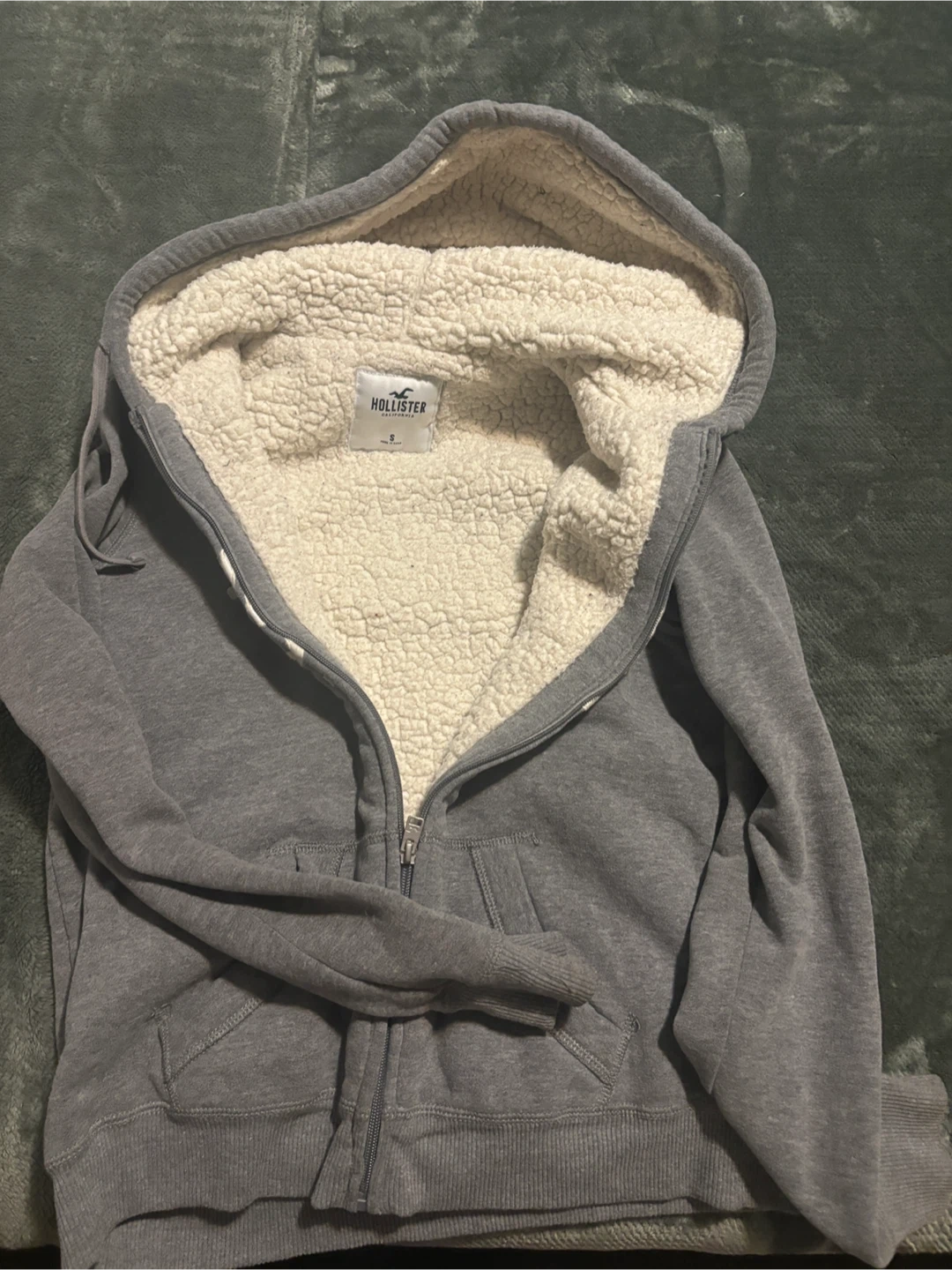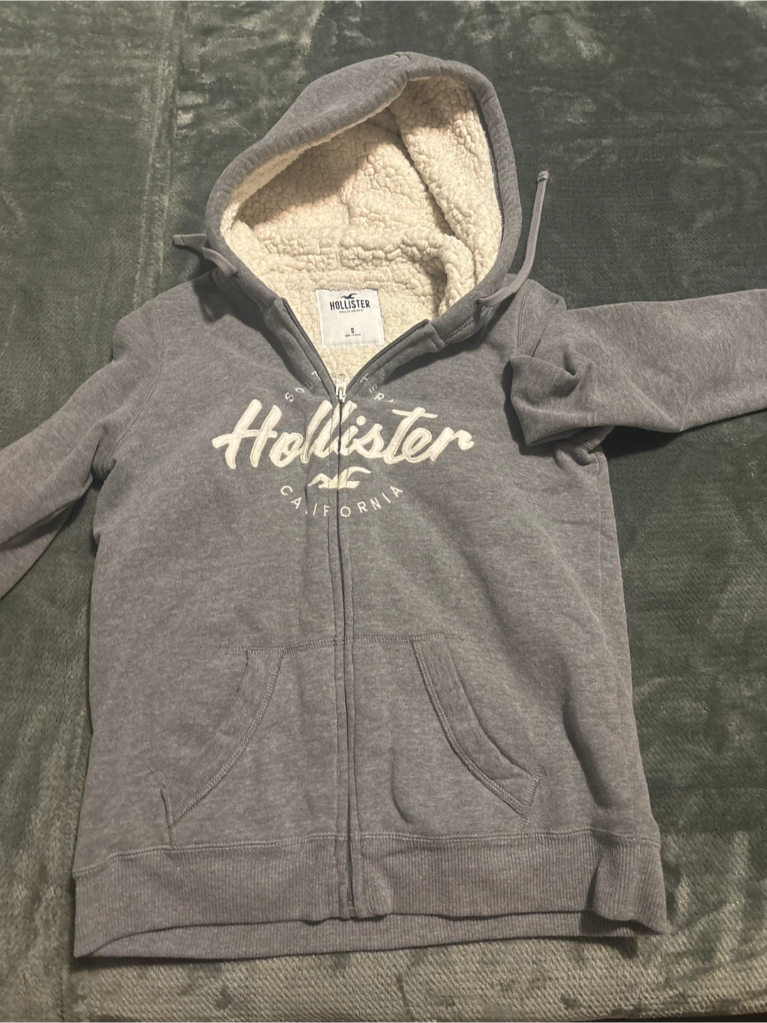 Cozy up with this Hollister hoodie! It's a size small and features a soft sherpa lining to keep you warm. The grey colour is super versatile, and it has a full zip and pockets, perfect for everyday wear. It's in great condition and ready for a new owner!