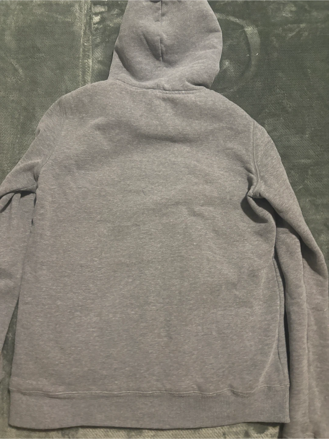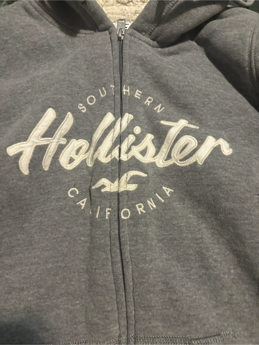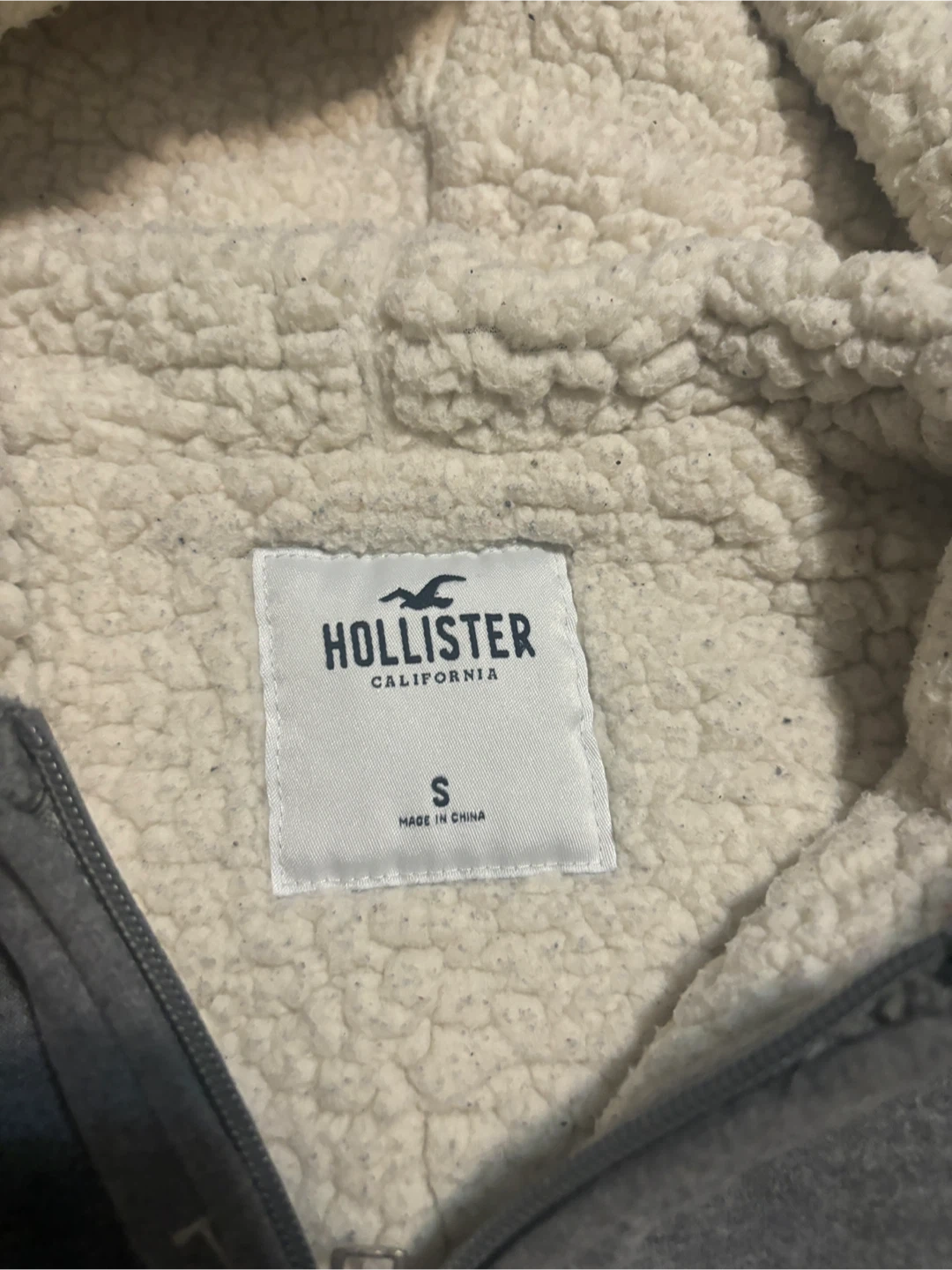 Cozy up with this Hollister hoodie! It's a size small and features a soft sherpa lining to keep you warm. The grey colour is super versatile, and it has a full zip and pockets, perfect for everyday wear. It's in great condition and ready for a new owner!