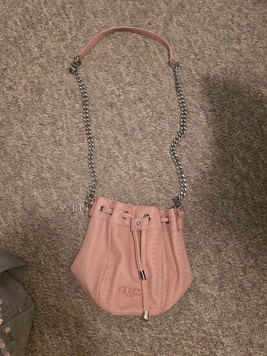Cute Guess bucket bag in a lovely pink colour! It features a chain strap and a drawstring closure. Perfect for adding a touch of style to any outfit