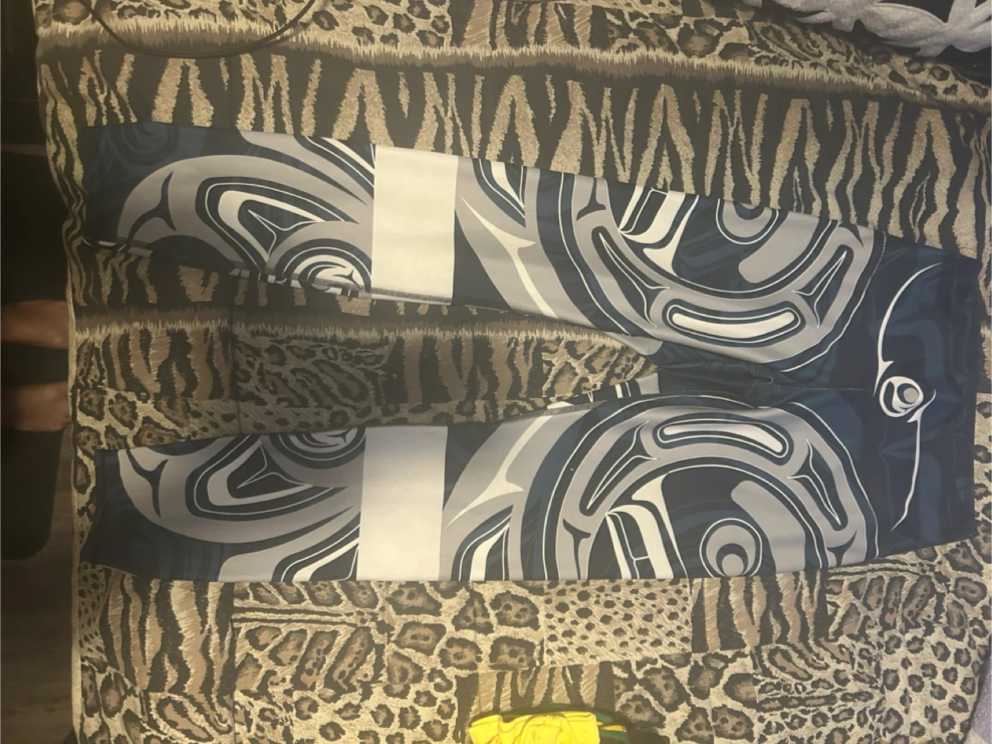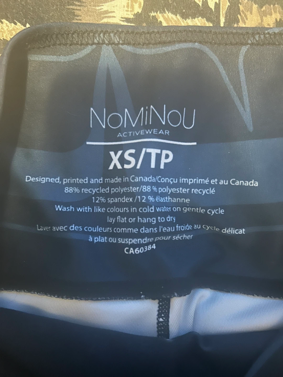 NoMiNou Activewear leggings in size XS. They are designed, printed, and made in Canada. The material is 88% recycled polyester and 12% elastane. Wash with like colours in cold water on gentle cycle, lay flat or hang to dry