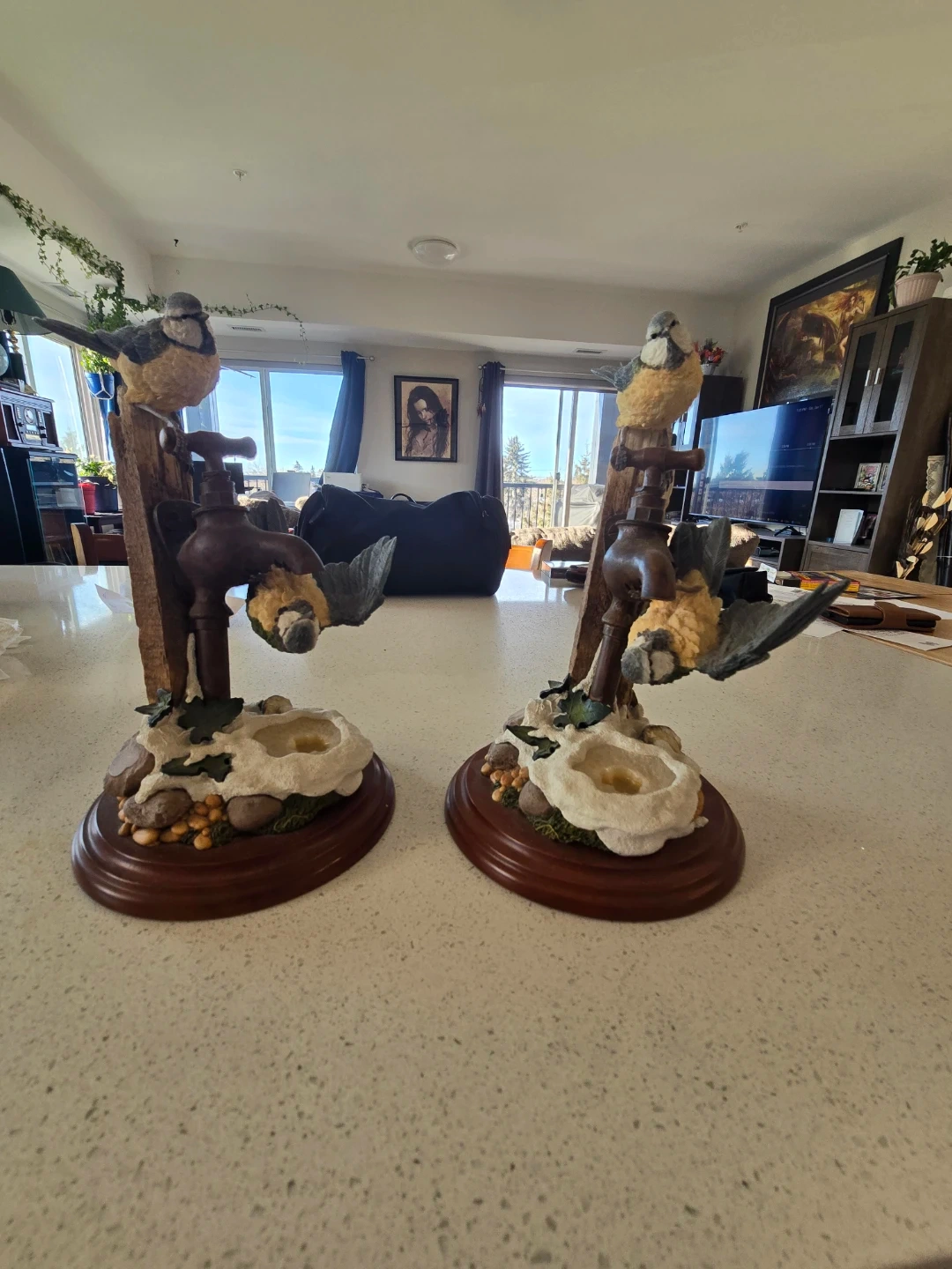 This is a charming Stratford Collection bird figurine. It features a bird perched on a faucet with a small basin below. The base is a rich, dark wood tone. It's hand-painted and makes a lovely decorative piece for any room