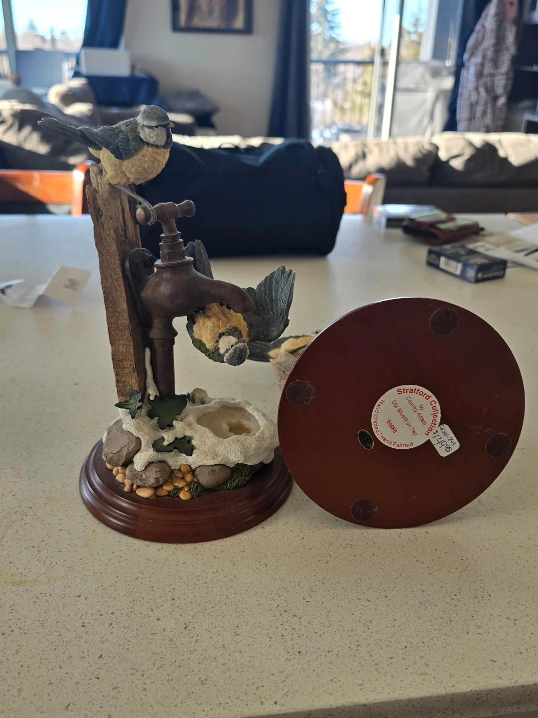 This is a charming Stratford Collection bird figurine. It features a bird perched on a faucet with a small basin below. The base is a rich, dark wood tone. It's hand-painted and makes a lovely decorative piece for any room
