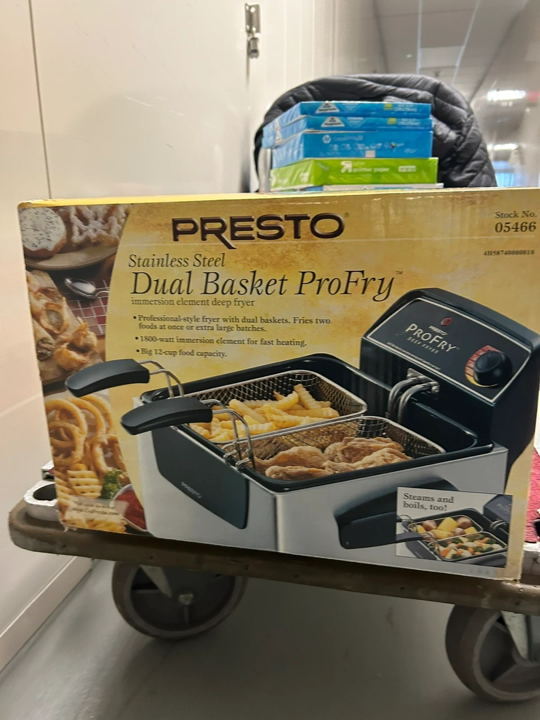 Selling a Presto Stainless Steel Dual Basket ProFry immersion element deep fryer! It features dual baskets, allowing you to fry two foods at once or extra large batches. It has a big 12-cup food capacity, perfect for frying family-size quantities of chicken or onion-shaped baskets. The 1800-watt immersion element provides quick preheating and fast oil temperature recovery. Also features an adjustable thermostat for easy selection of a variety of frying temperatures