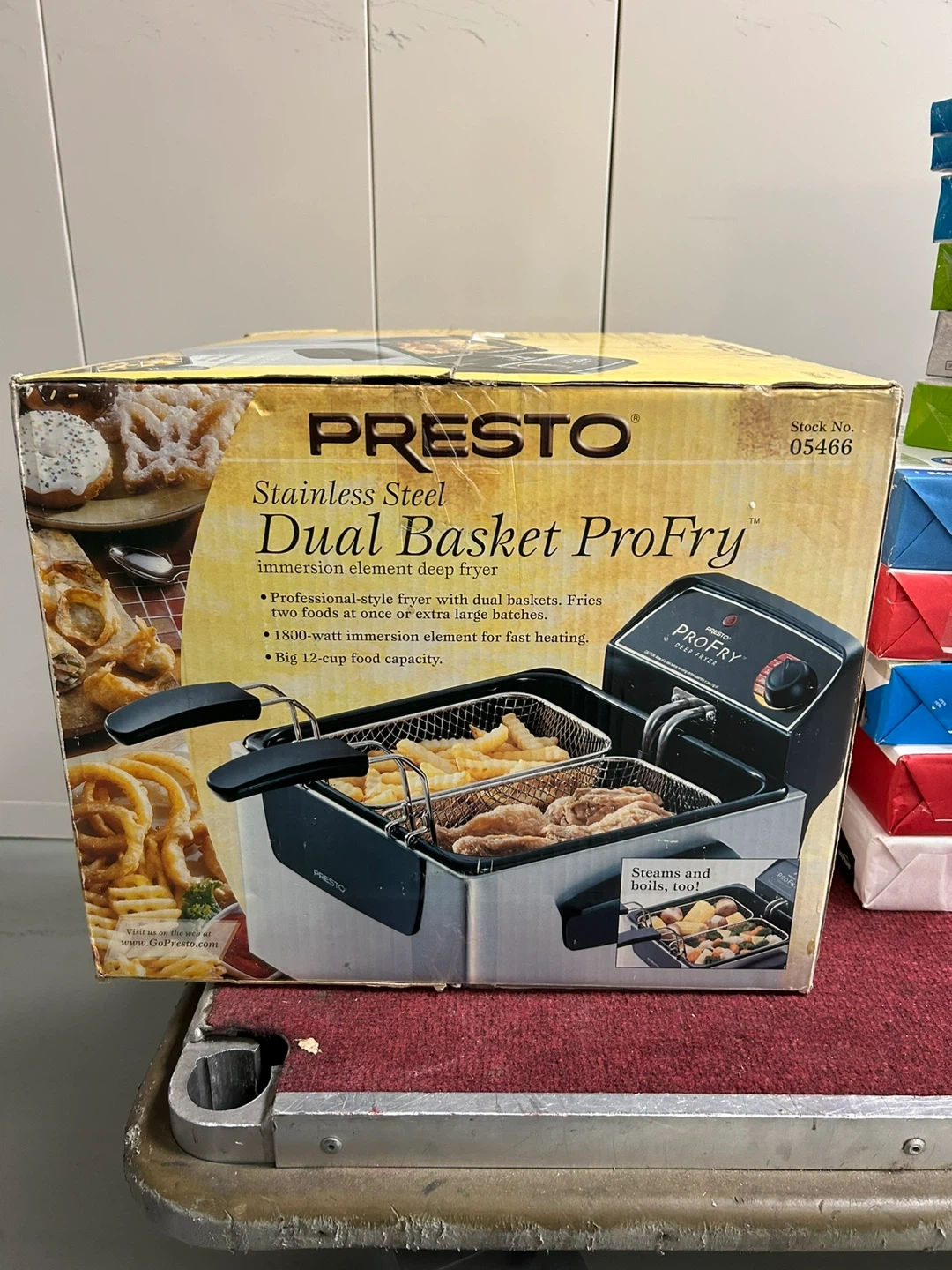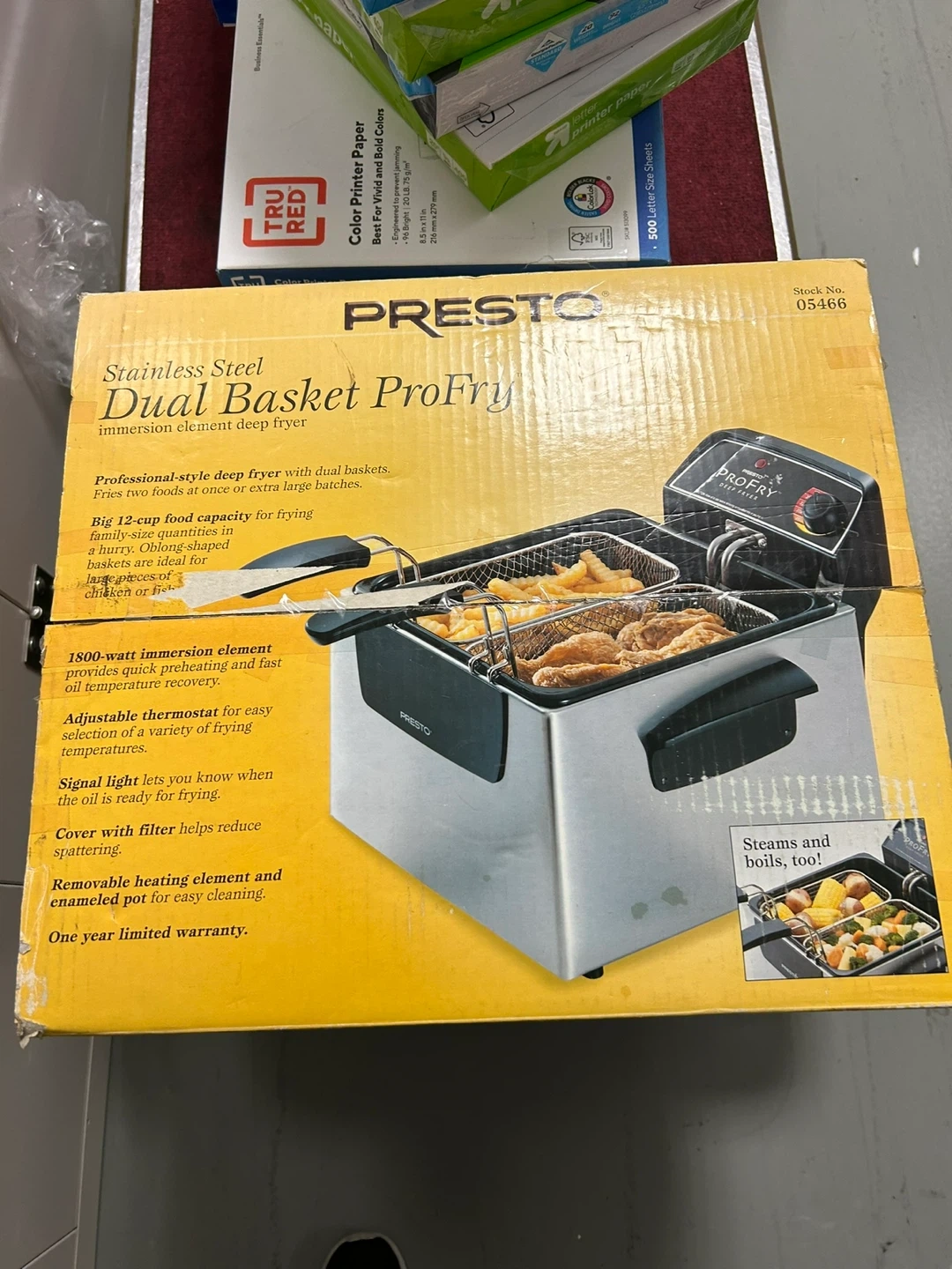 Selling a Presto Stainless Steel Dual Basket ProFry immersion element deep fryer! It features dual baskets, allowing you to fry two foods at once or extra large batches. It has a big 12-cup food capacity, perfect for frying family-size quantities of chicken or onion-shaped baskets. The 1800-watt immersion element provides quick preheating and fast oil temperature recovery. Also features an adjustable thermostat for easy selection of a variety of frying temperatures