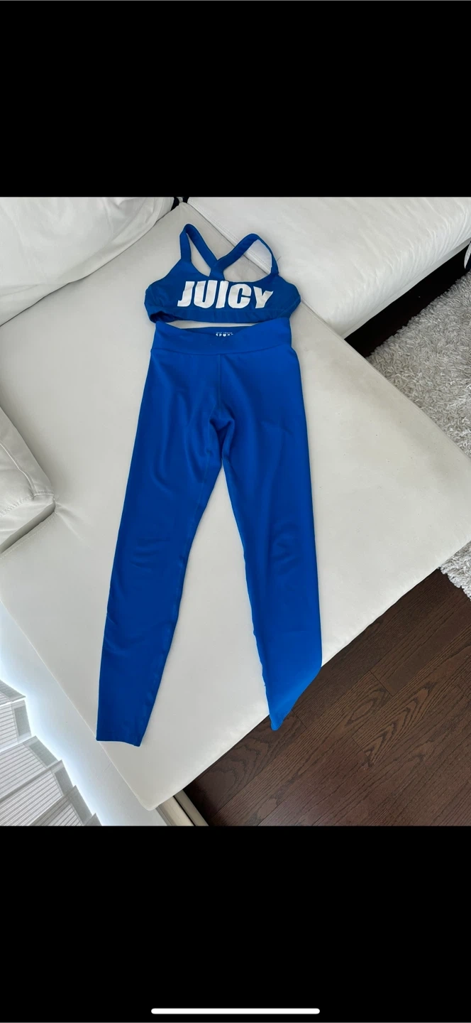 Selling a cute Juicy Couture activewear set in a vibrant blue! It includes a sports bra with the Juicy logo and matching leggings. Perfect for workouts or just lounging around in style
