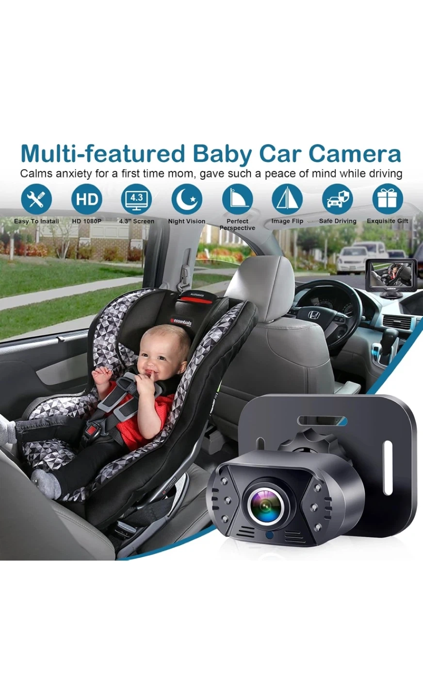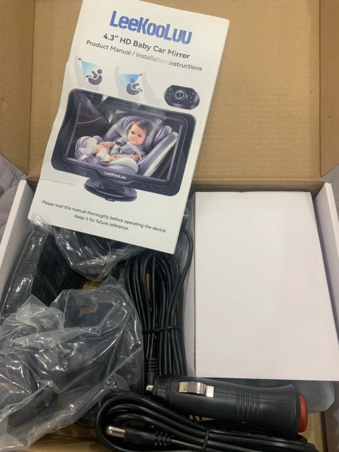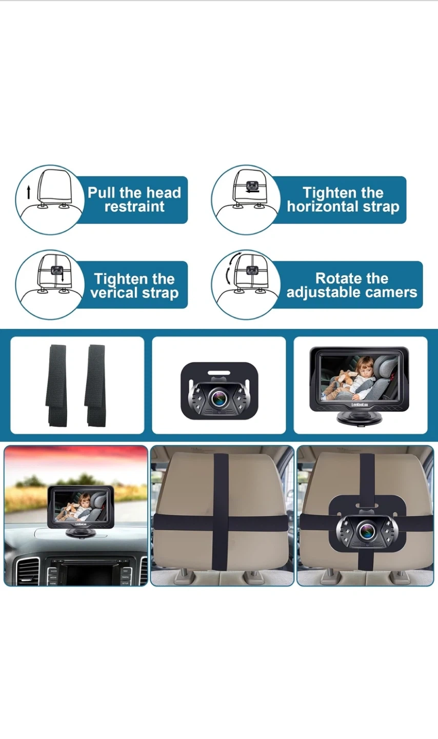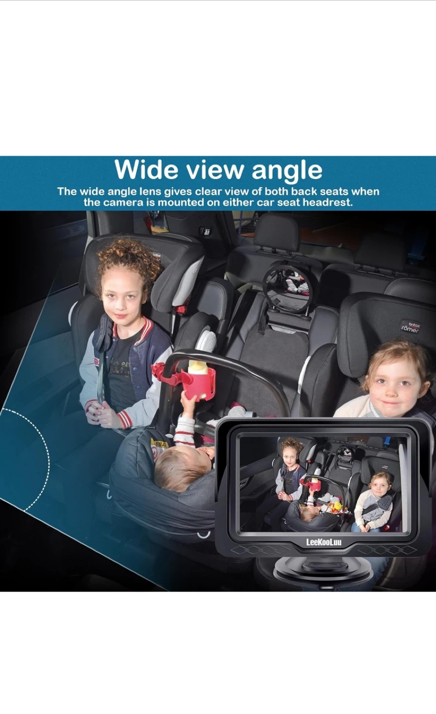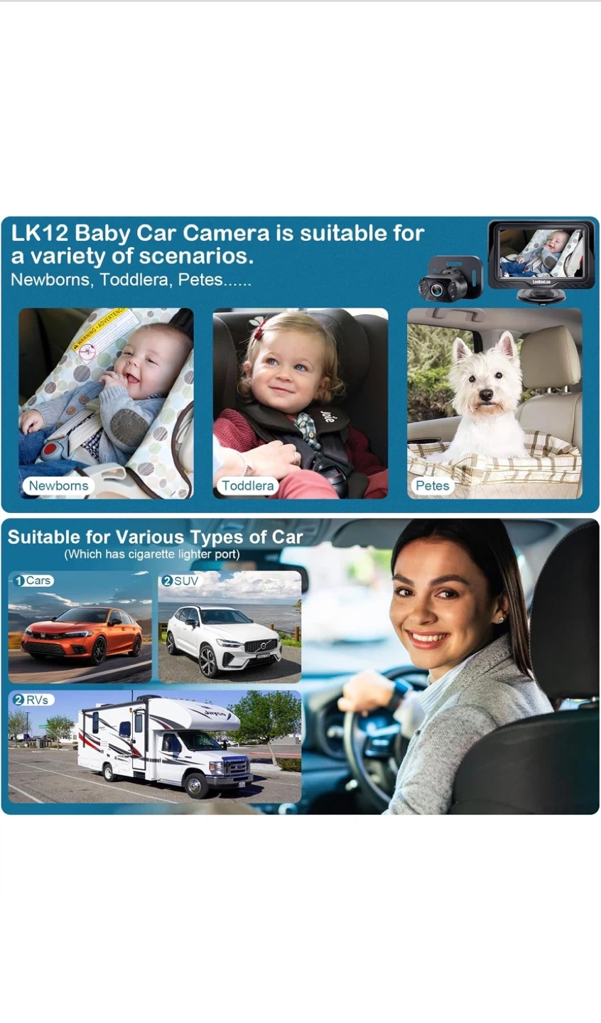 Selling a brand new LeeKooLuu LK12 baby car camera! This camera is designed to give you a wide angle view of both back seats when the camera is mounted on either car seat headrest. It's suitable for newborns, toddlers, and even pets! The box is included