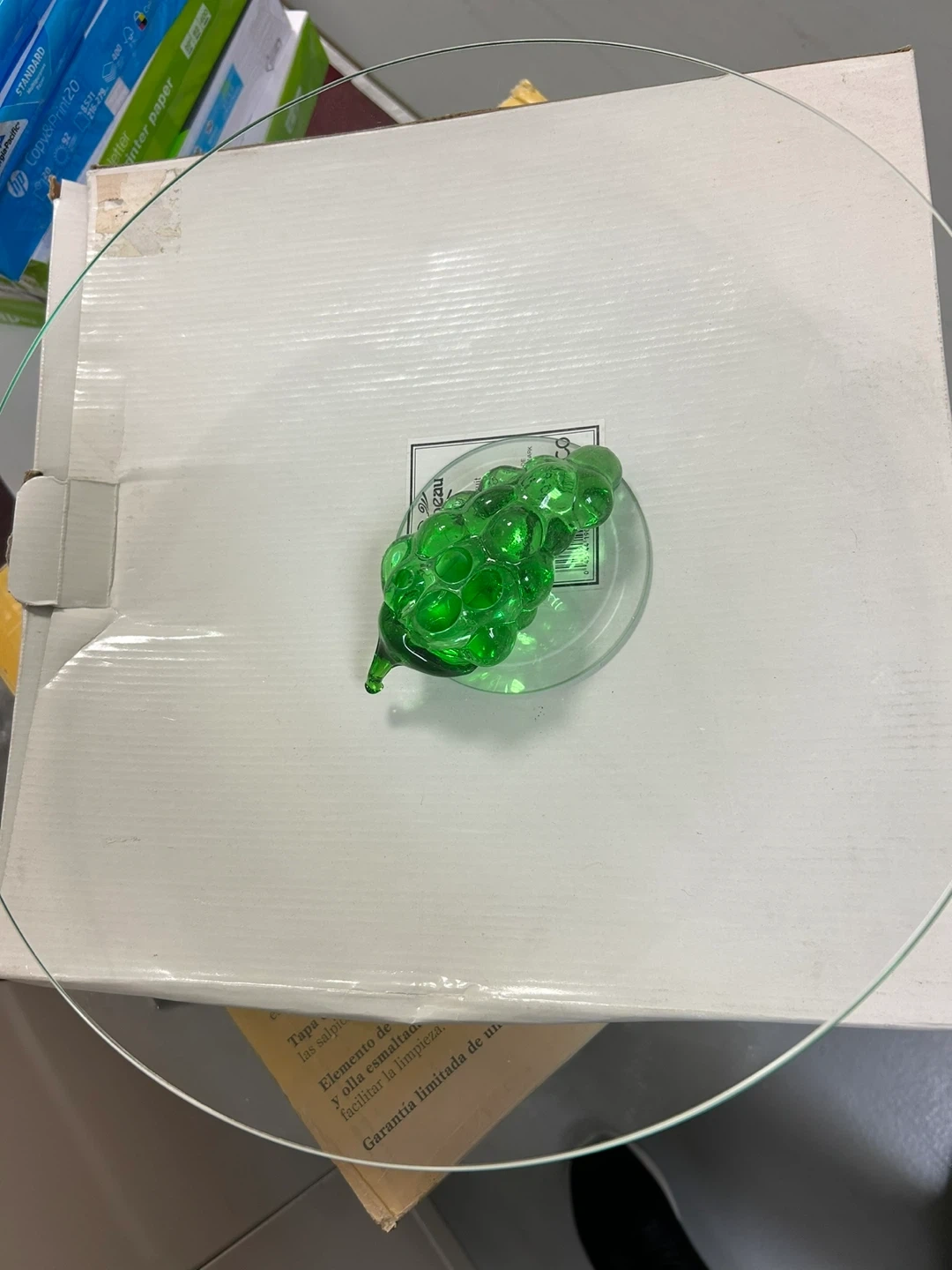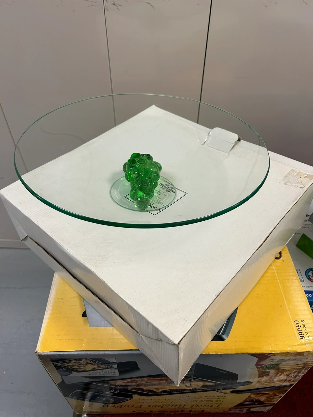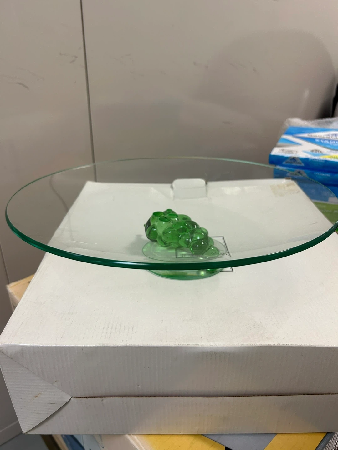 Selling a lovely Arcoroc cake stand! It features a clear glass plate with a decorative green glass grape cluster in the center. Perfect for displaying your favorite cakes or desserts.