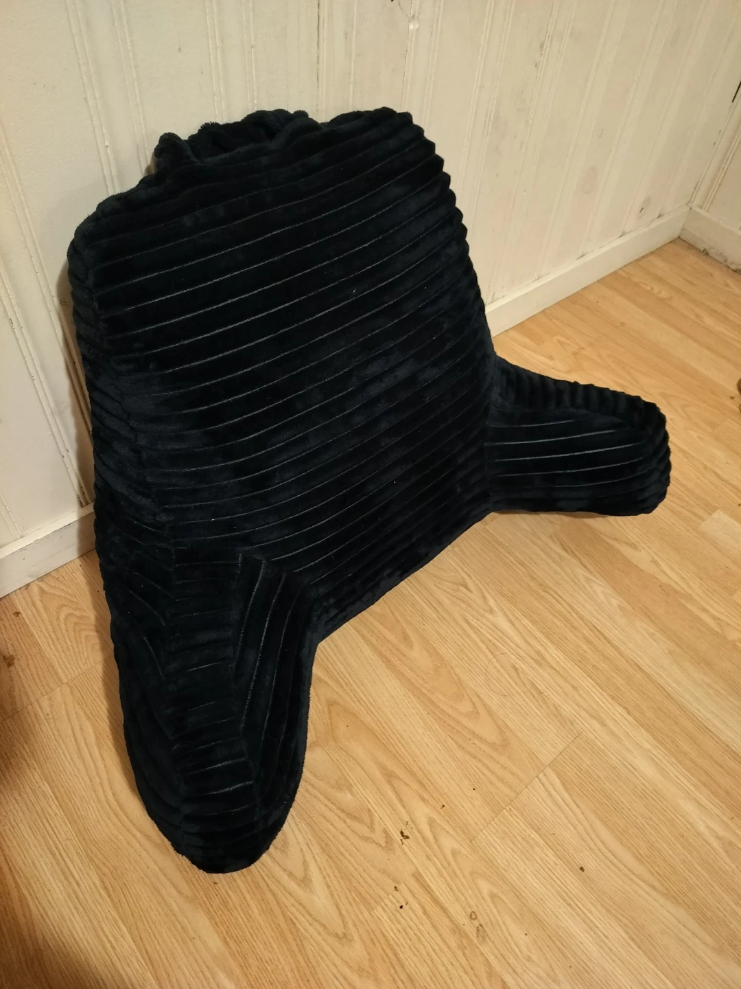 Here's a comfy black bed rest pillow! It's in great shape and perfect for reading or watching TV in bed. It provides excellent support and is made of a soft, cozy material.