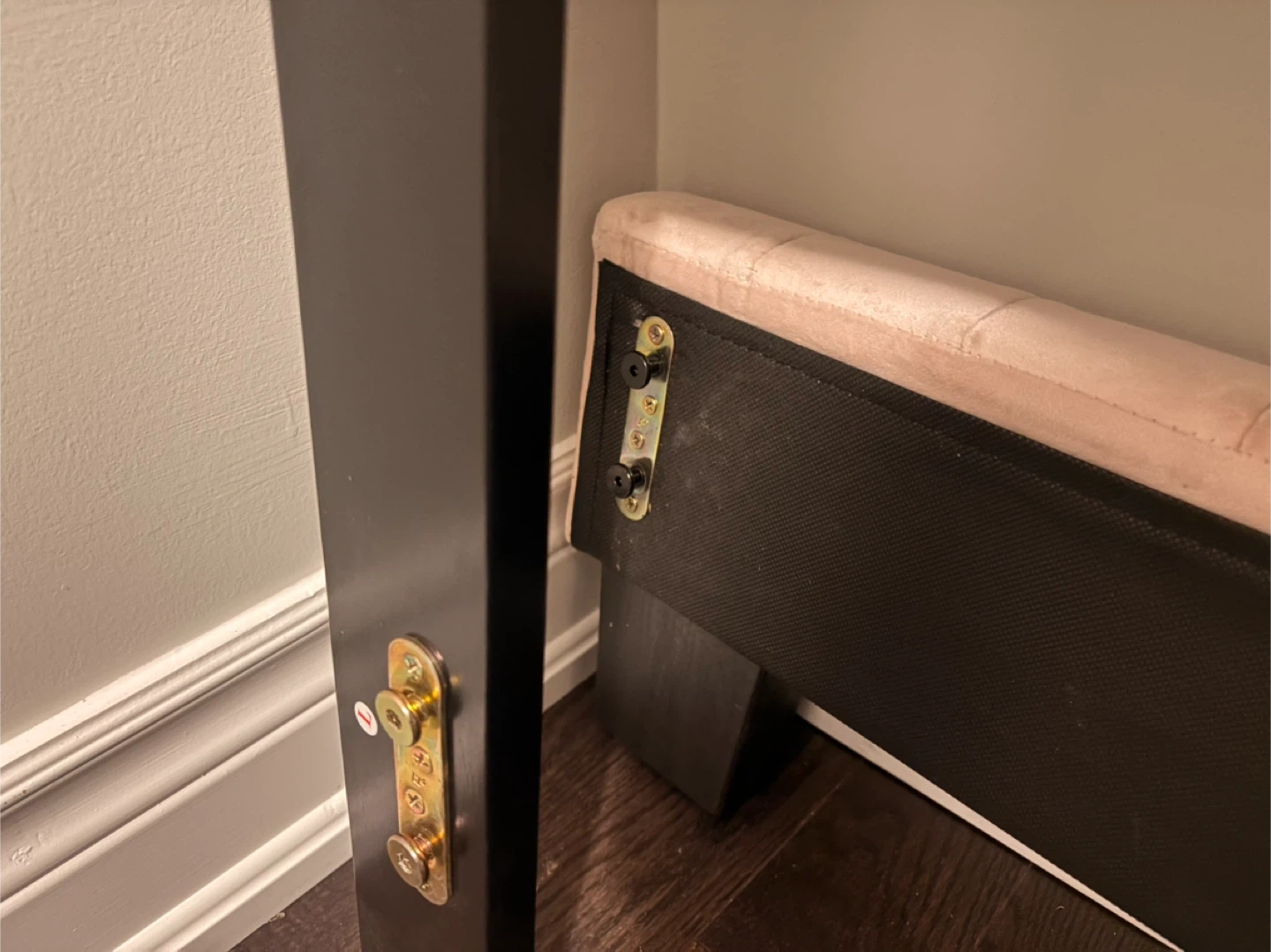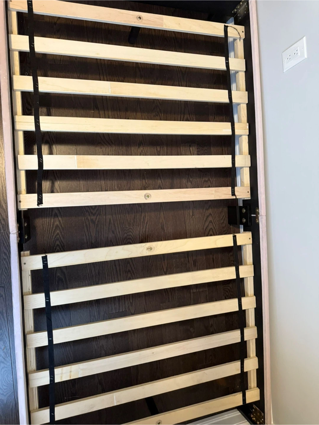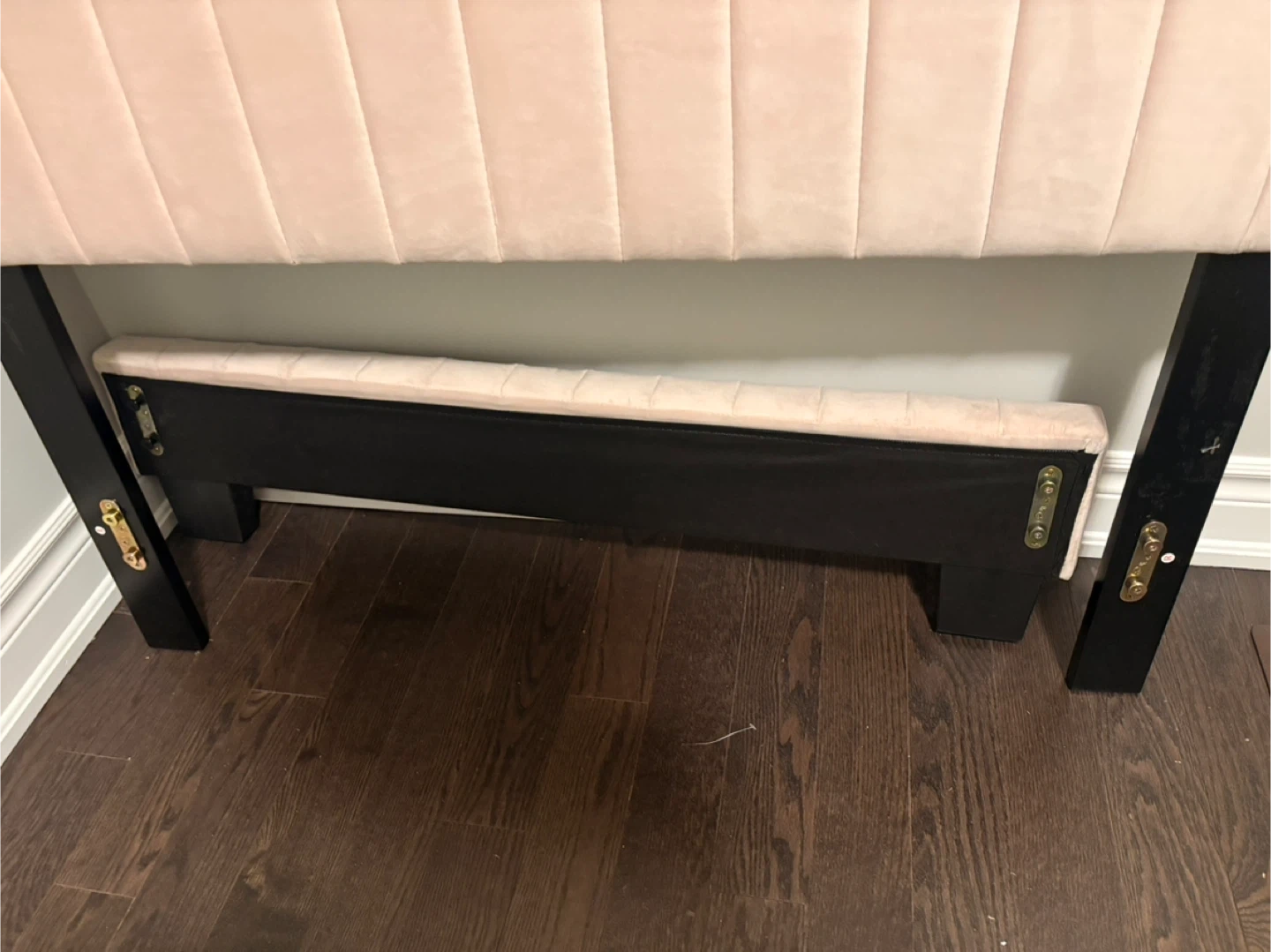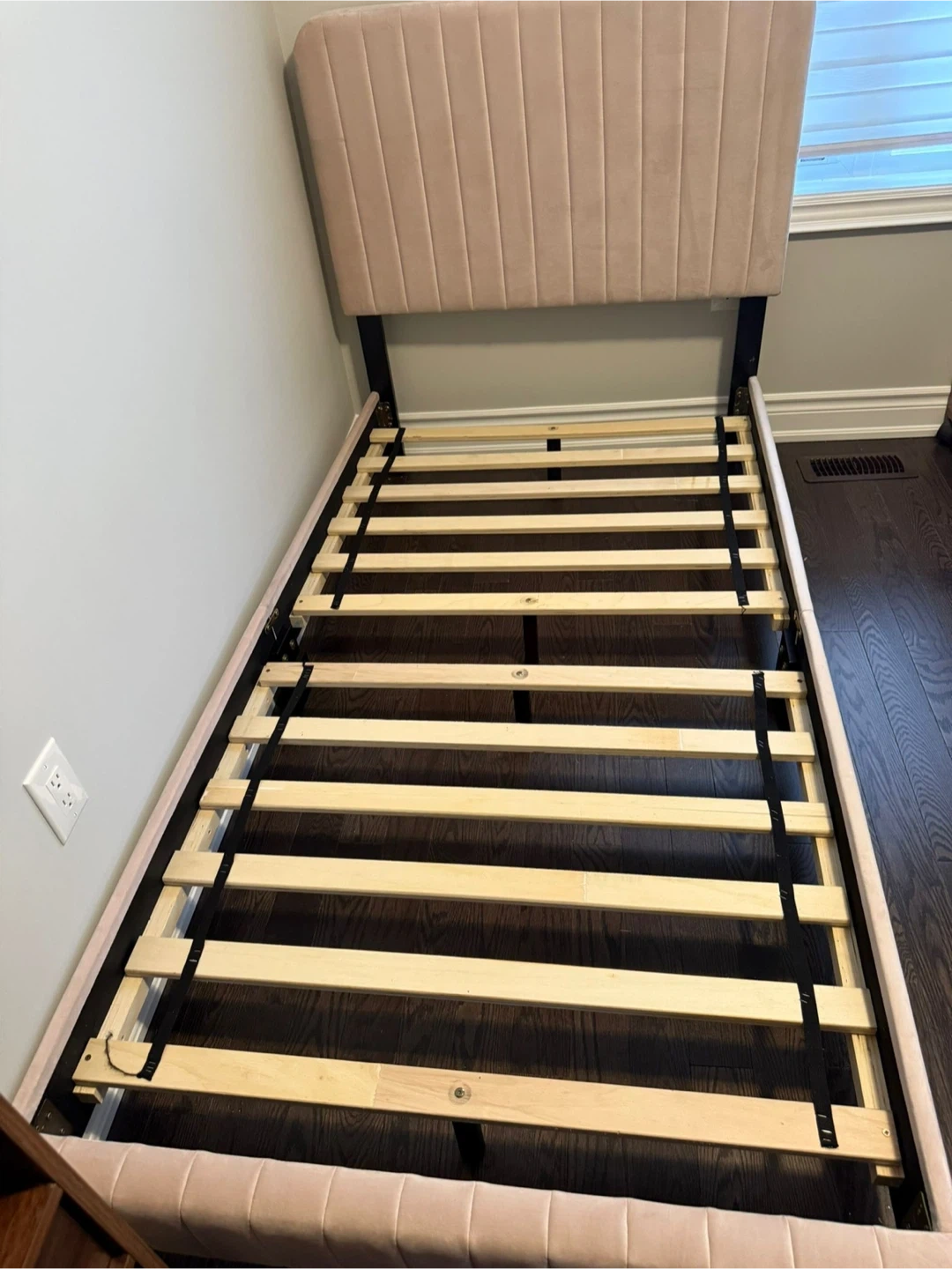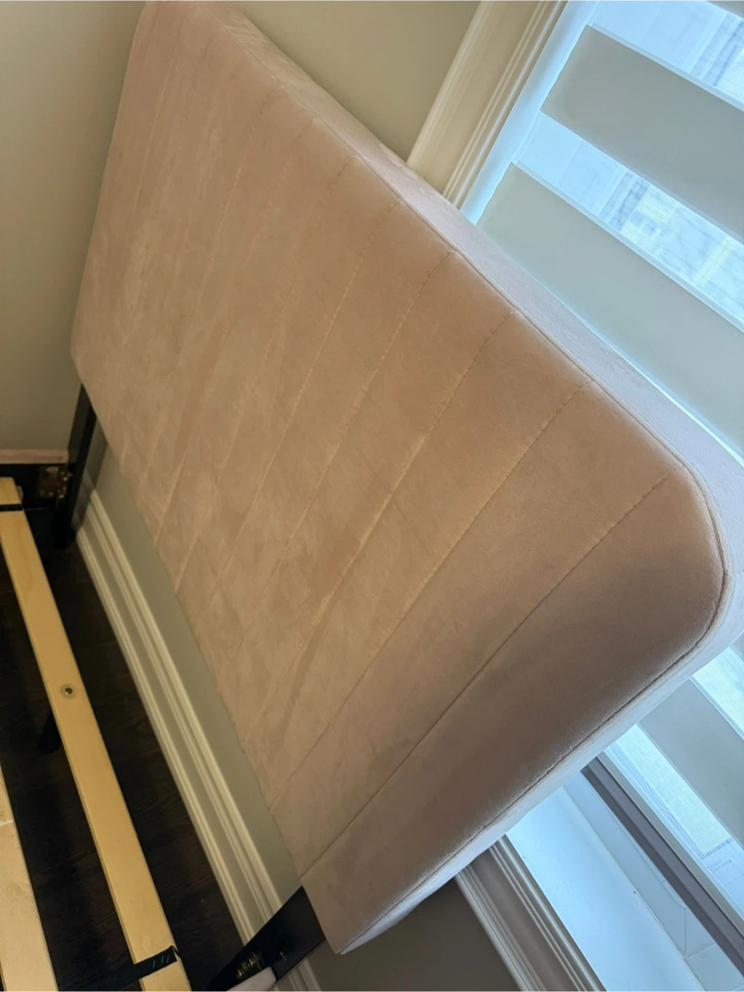Selling a lovely upholstered bed frame! It's in great condition and ready to add a touch of elegance to your bedroom. The frame features a soft, padded headboard and a sturdy wooden slat support system. It was in my guest room. Pale pink