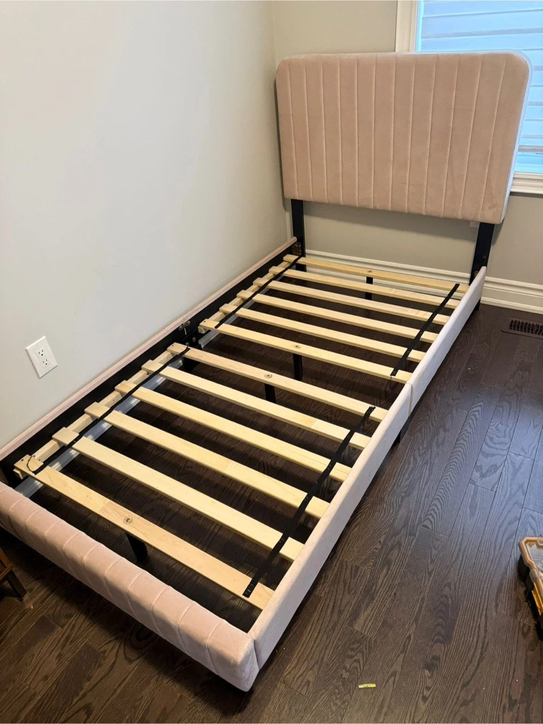 Selling a lovely upholstered bed frame! It's in great condition and ready to add a touch of elegance to your bedroom. The frame features a soft, padded headboard and a sturdy wooden slat support system. It was in my guest room. Pale pink