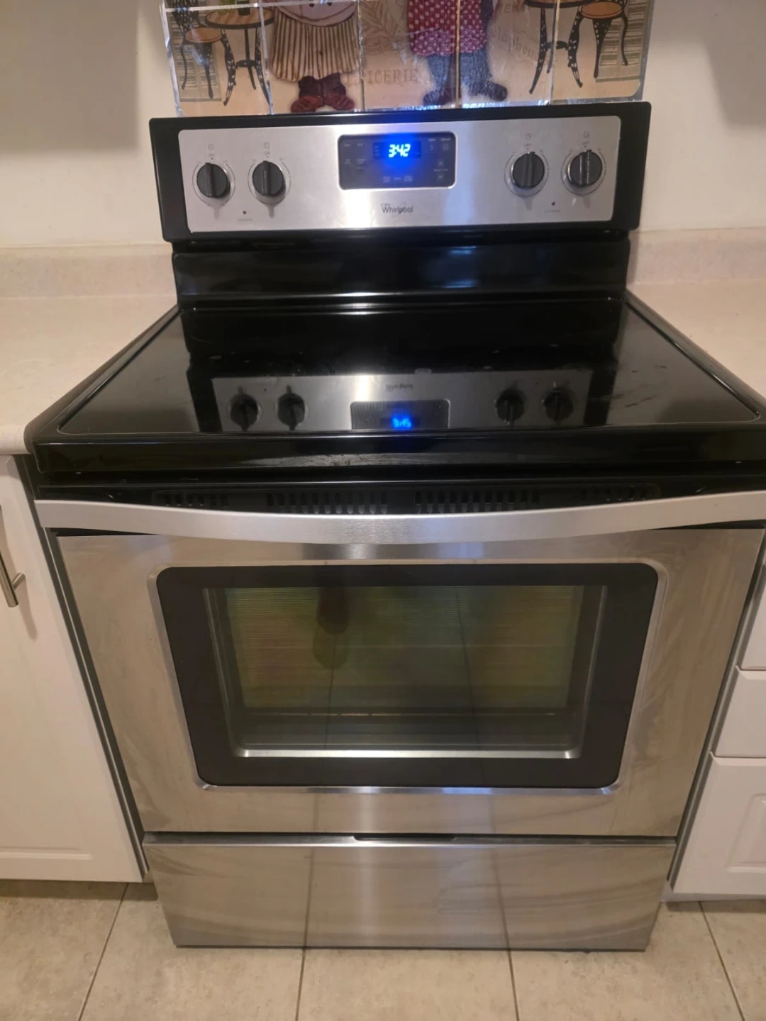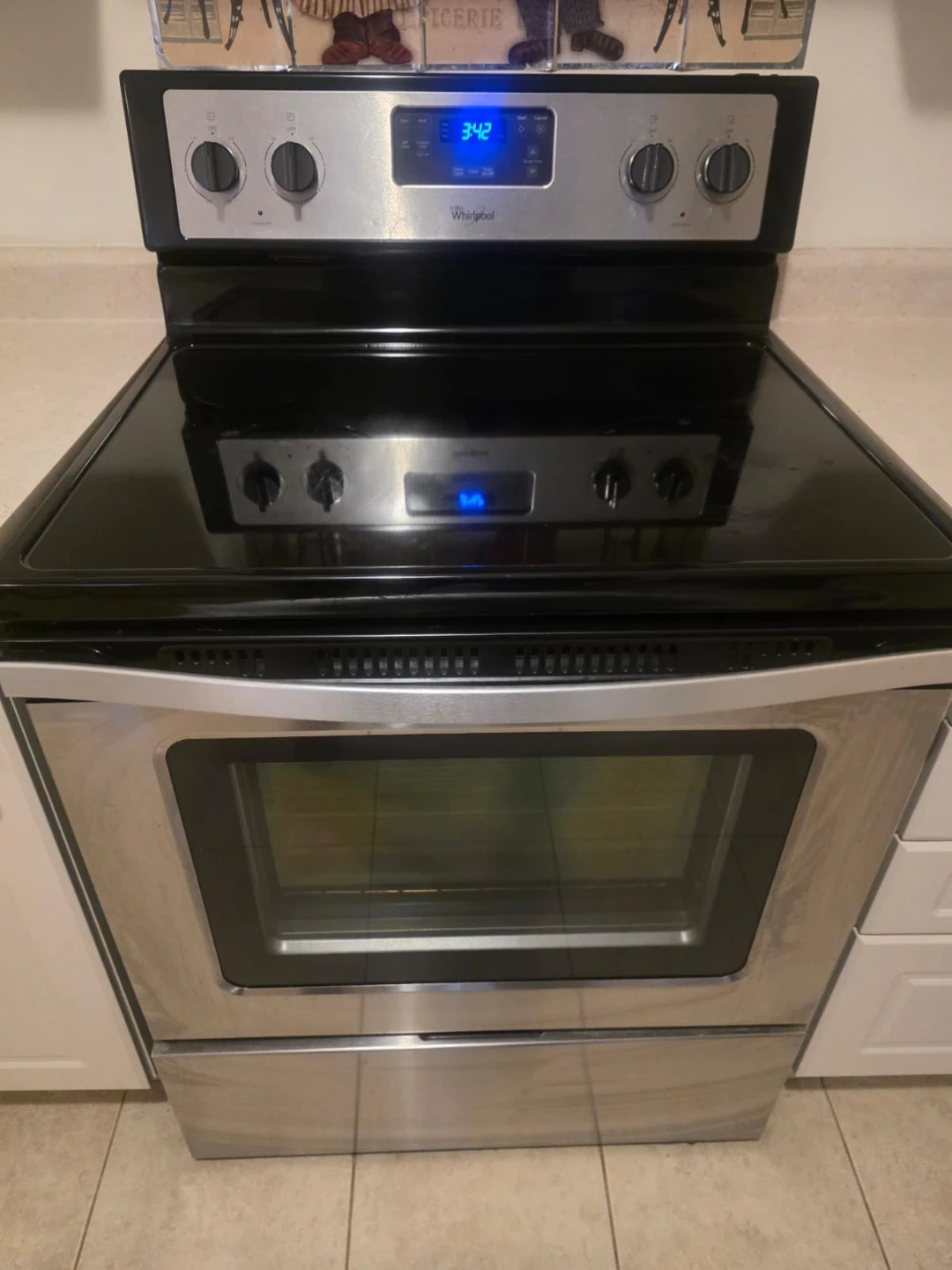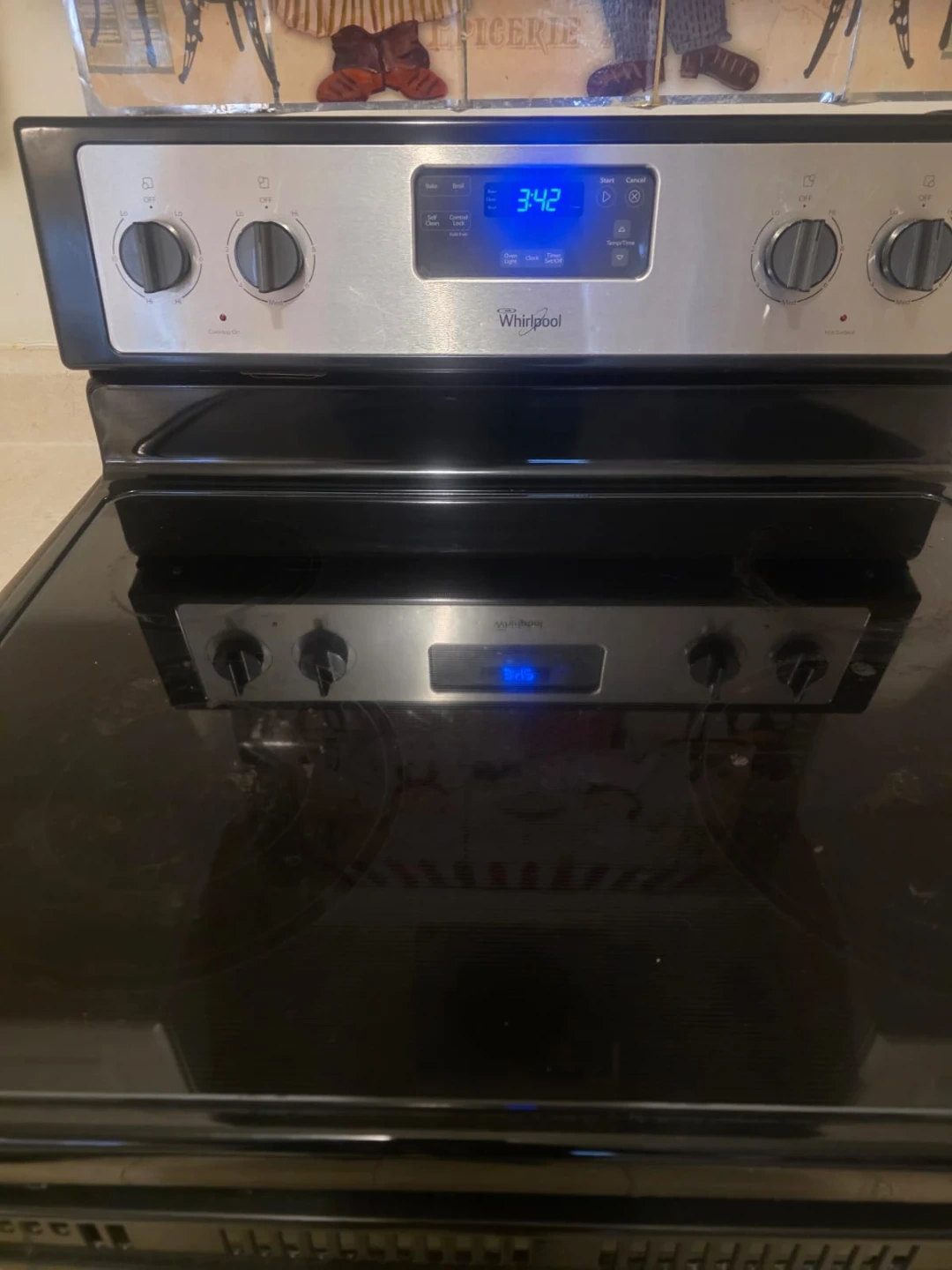 Selling a Whirlpool electric range in stainless steel. It's in great condition and ready for a new kitchen! The cooktop is black glass and the oven is self-cleaning