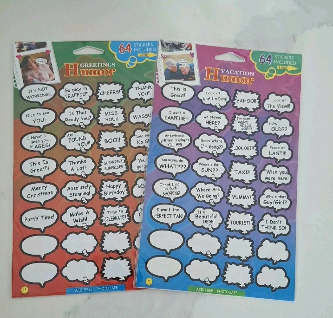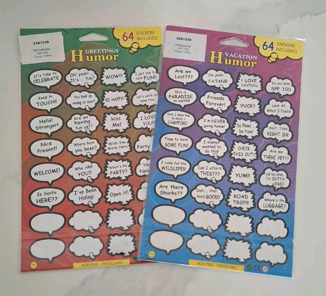 Two packs of humor stickers for all your crafting and decorating needs! Each pack includes 64 stickers with fun sayings and designs. Acid-free and photo safe.