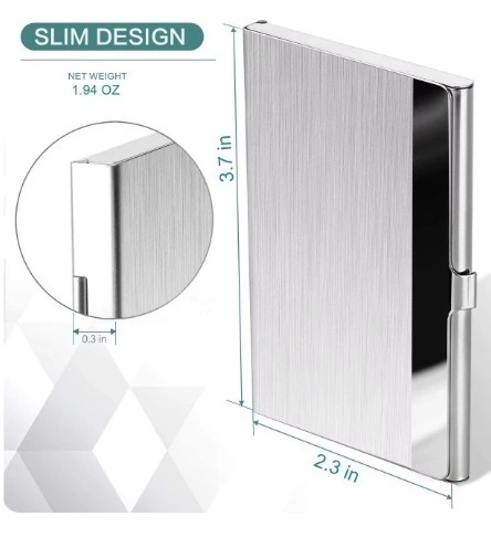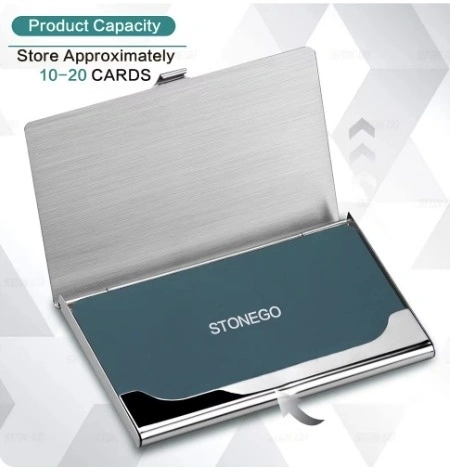 - Store approximately 10-20 business cards, also suitable for ID cards, credit cards, gift cards, and more. Stonego business card case is made of premium stainless steel. Size: 3.7"L x 2.3"W x 0.3"H