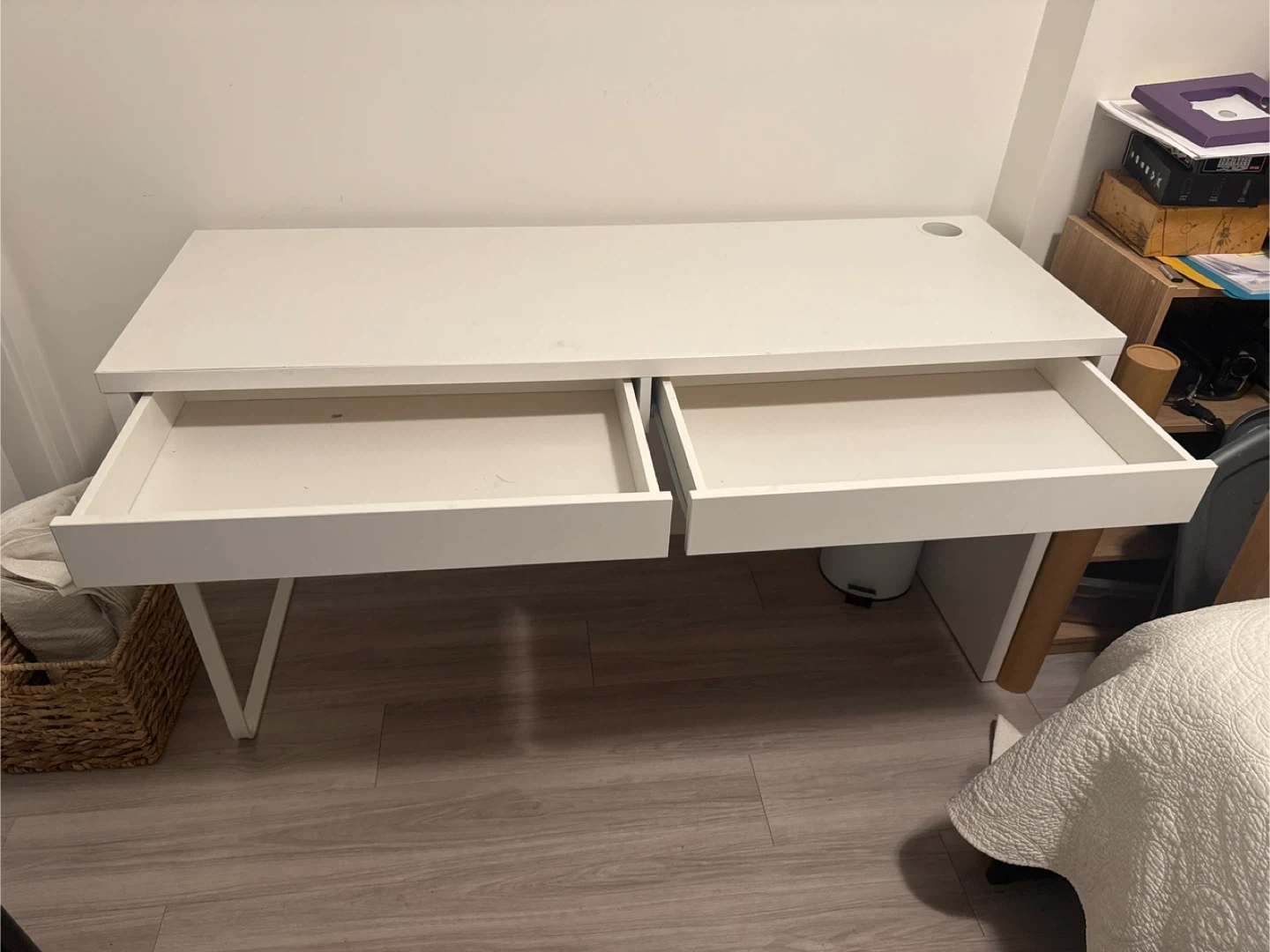 Selling a simple white IKEA MICKE desk (retail $159) with built-in drawers! It's perfect for a home office or study space. The desk is in great shape and ready for a new home. It's a clean and functional piece.