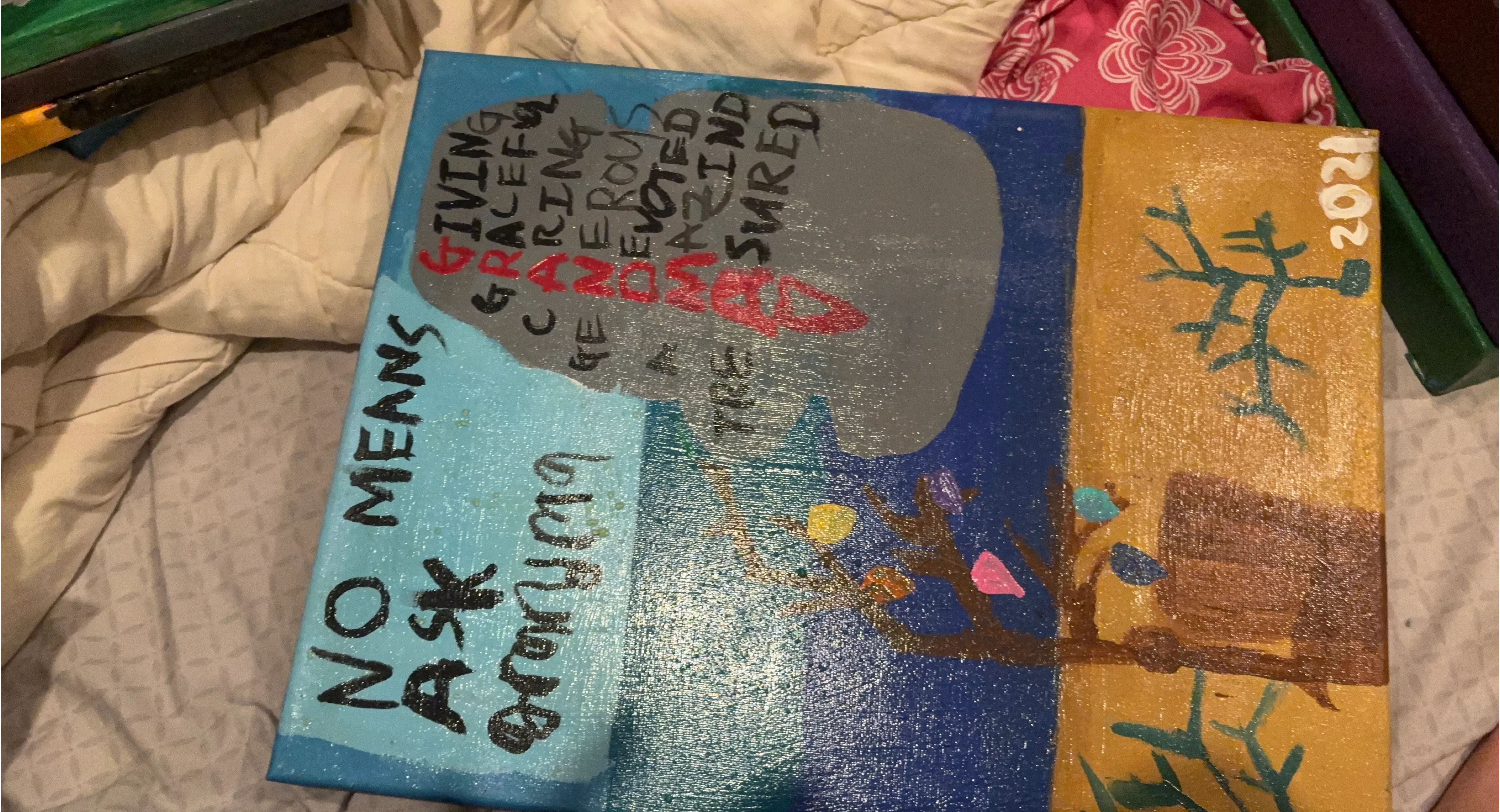 Selling a hand-painted canvas art piece from 2021. It features a unique design with various colours and textures. A great addition to any art collection or as a decorative piece for your home