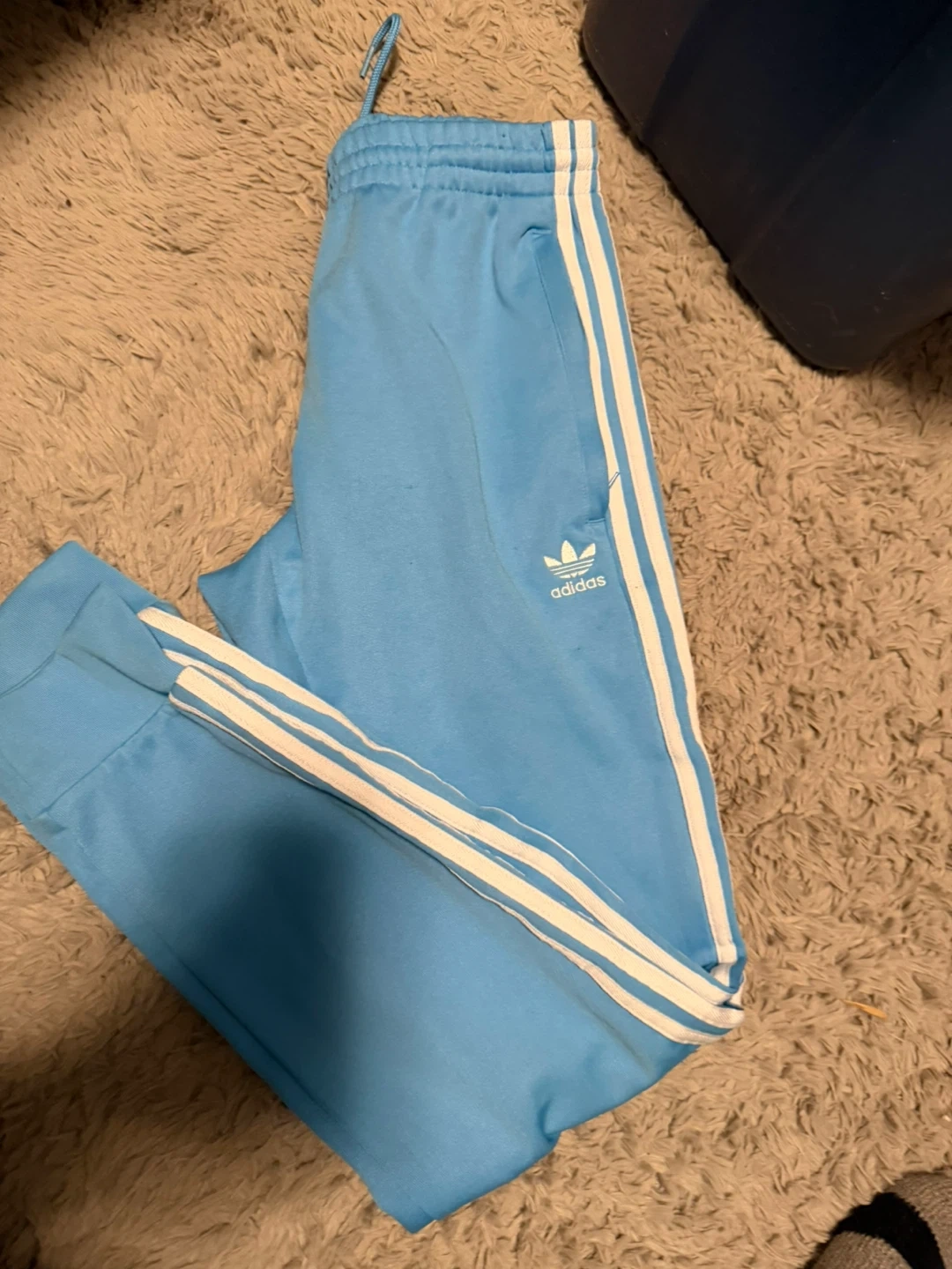 Selling a pair of Adidas track pants in a lovely light blue colour! They feature the classic three white stripes down the sides and the Adidas logo near the hip. Perfect for lounging or running errands