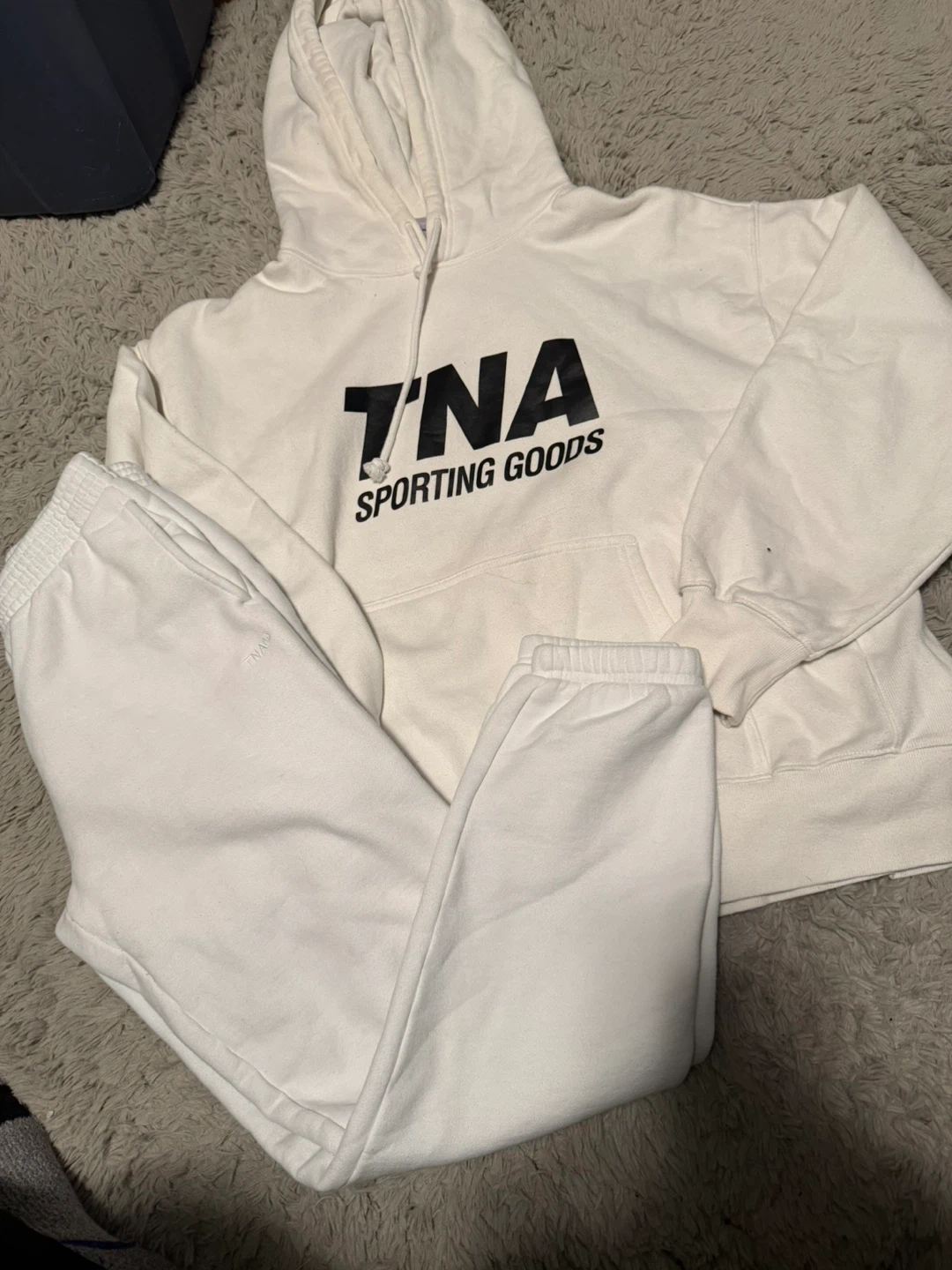 Selling a TNA matching set! It includes a hoodie and sweatpants, both in white. Perfect for lounging or running errands. The logo is on the hoodie.