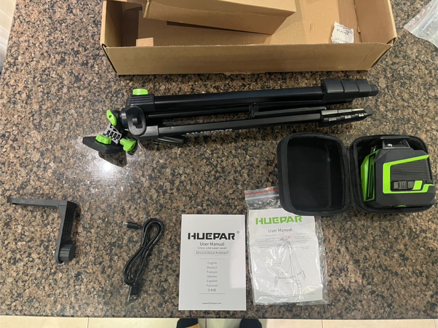 Selling a brand new Huepar D011CG Cross Line Laser Level, never used and still in its original box! It comes with all the original components, including the user manual, tripod, carrying case, and USB charging cable. This laser level is perfect for various home improvement and construction projects.